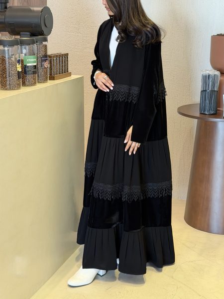 قماش العباية: مخمل شيفون اسود بنقشات ورود مخمل وردية مع مخمل مكسر وردي فالاكمام.