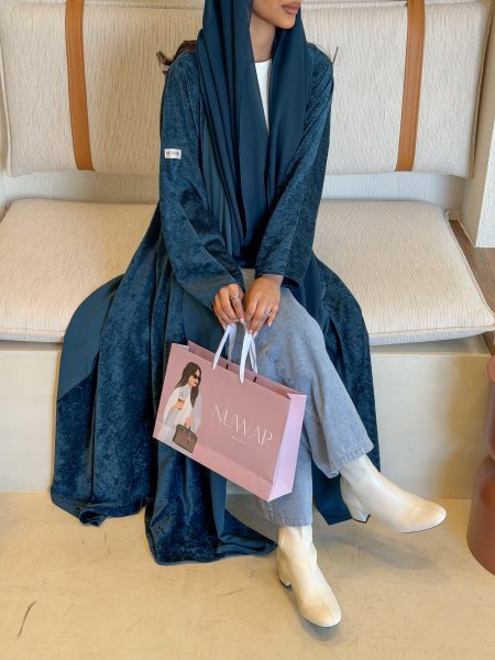 عباية شتويّة باللون الاسود بنقشات مخمليه ورديه
