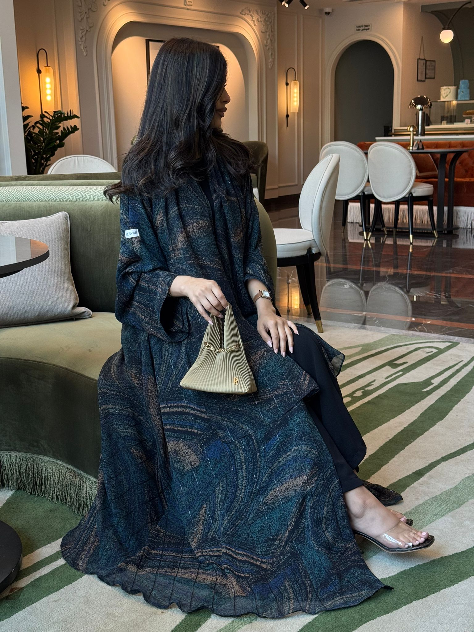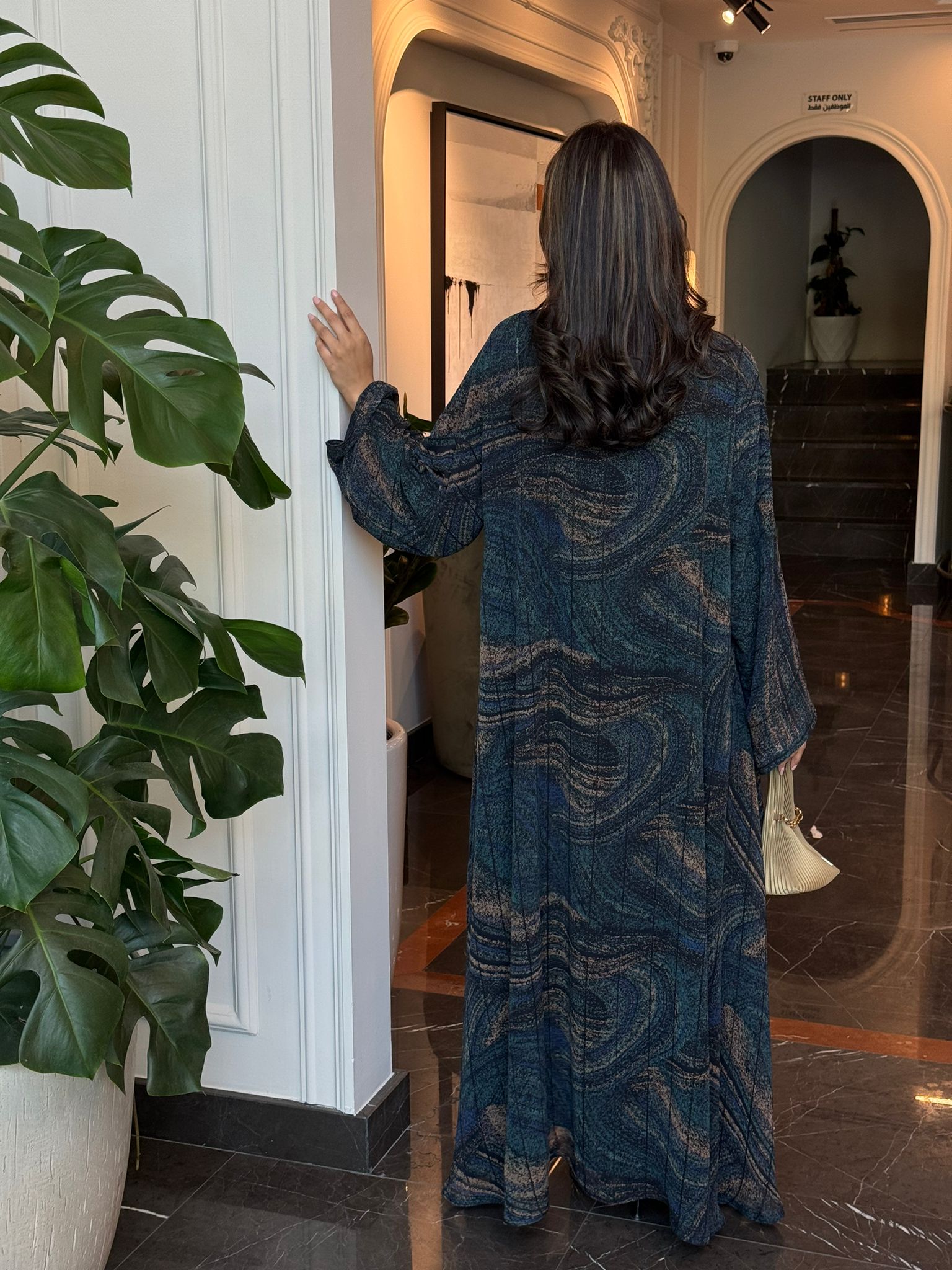 عباية بمزيج من الوان التركواز الغامق و الاخضر و البيج بنقشة الورود السوداء مع خطوط الفولك اللامع.