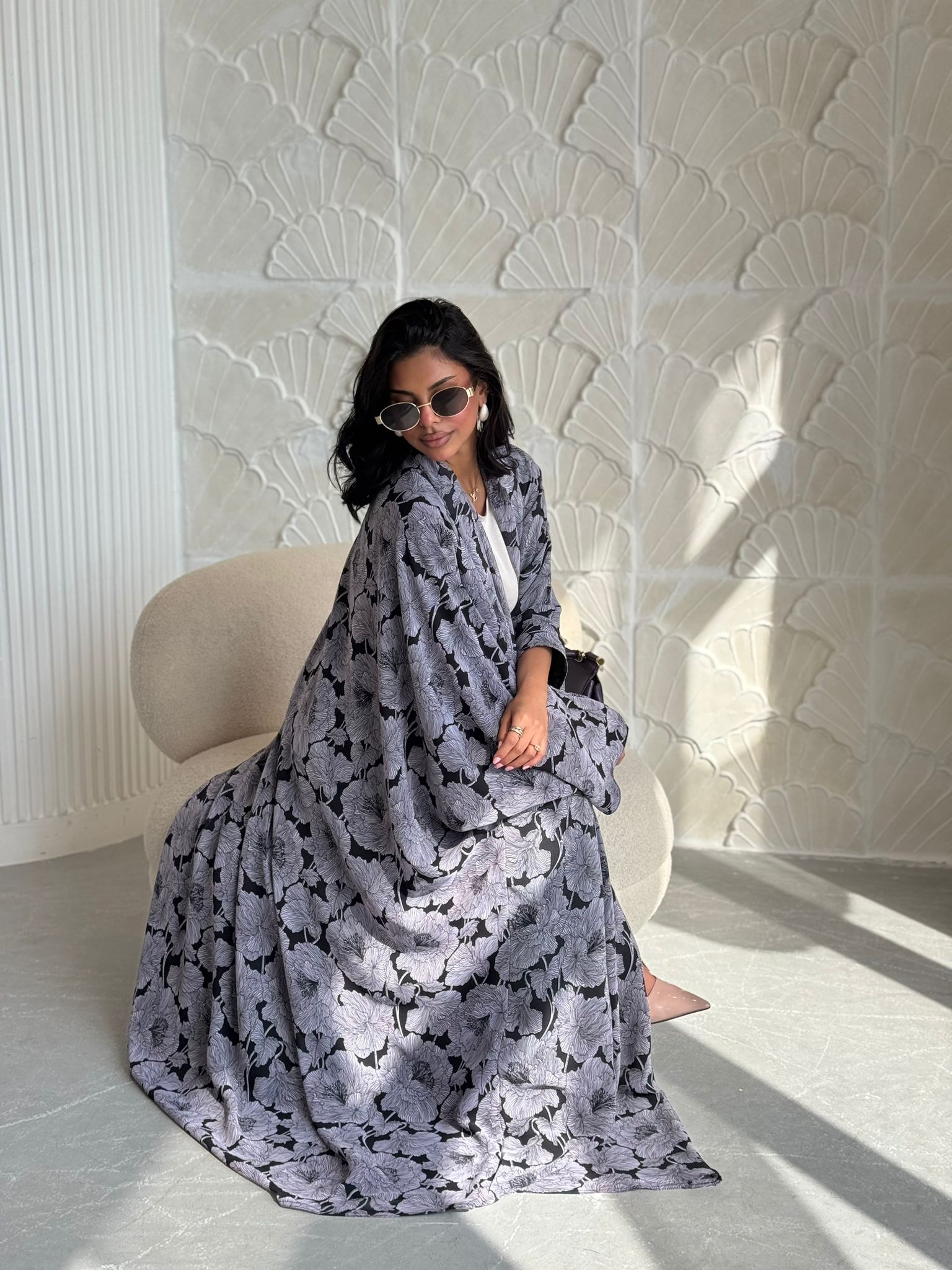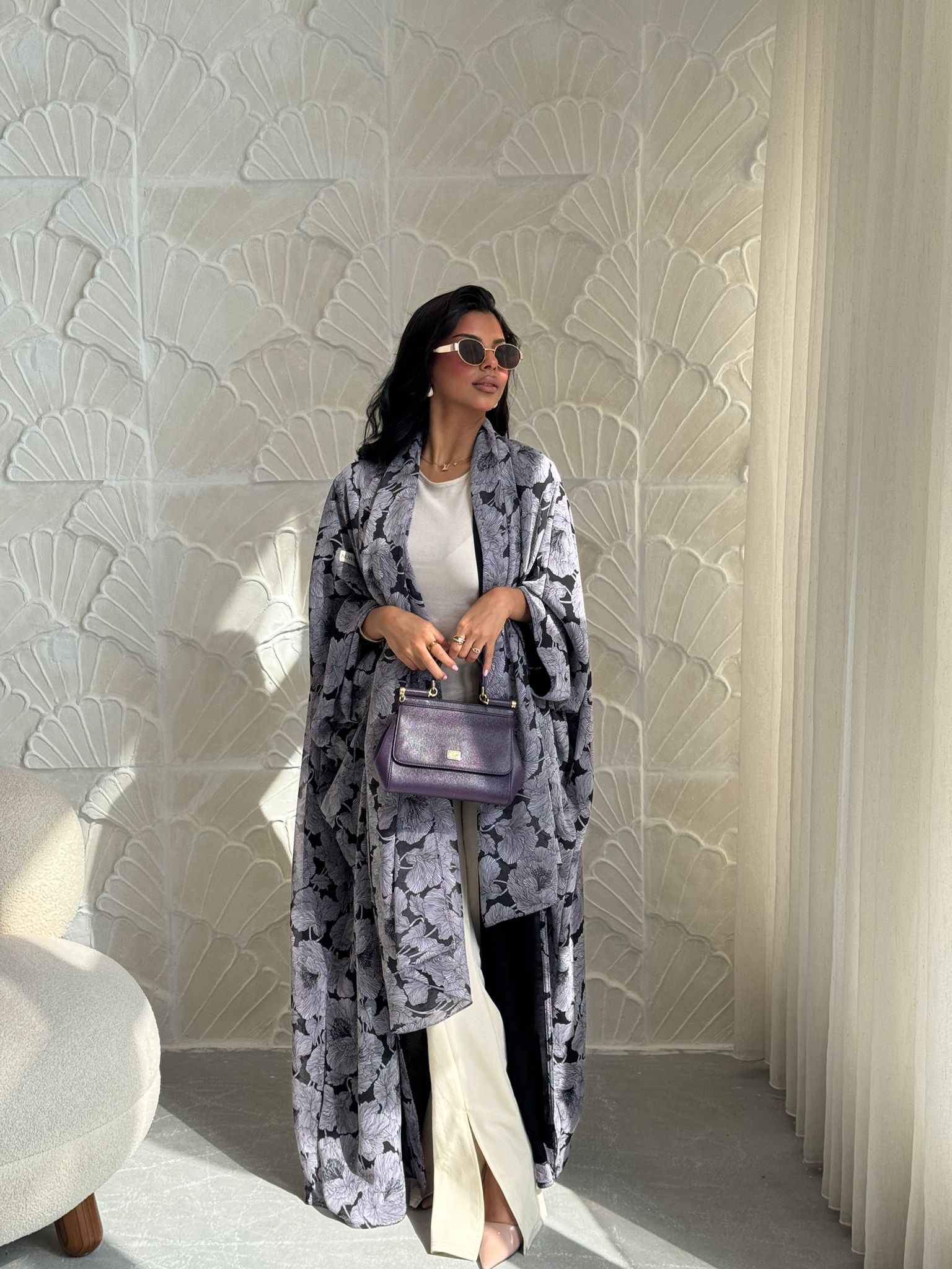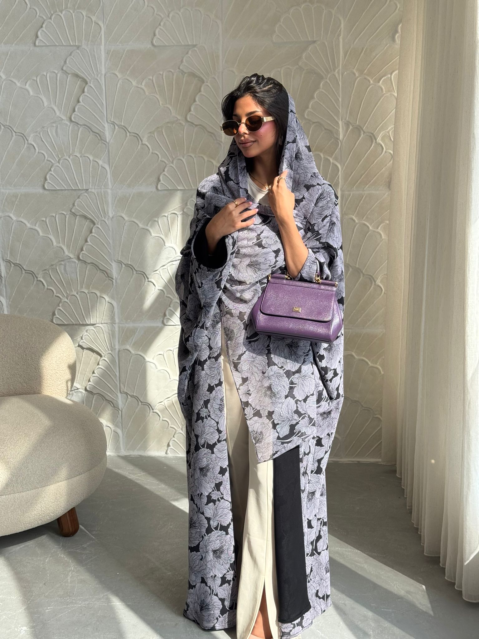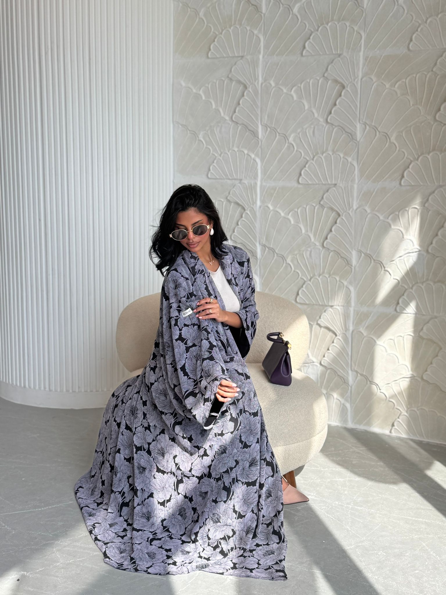 قماش العبايه: شيفون مبطن اسود بنقشات ورود بنفسجيه فاتحه. قصة العبايه: بشت
