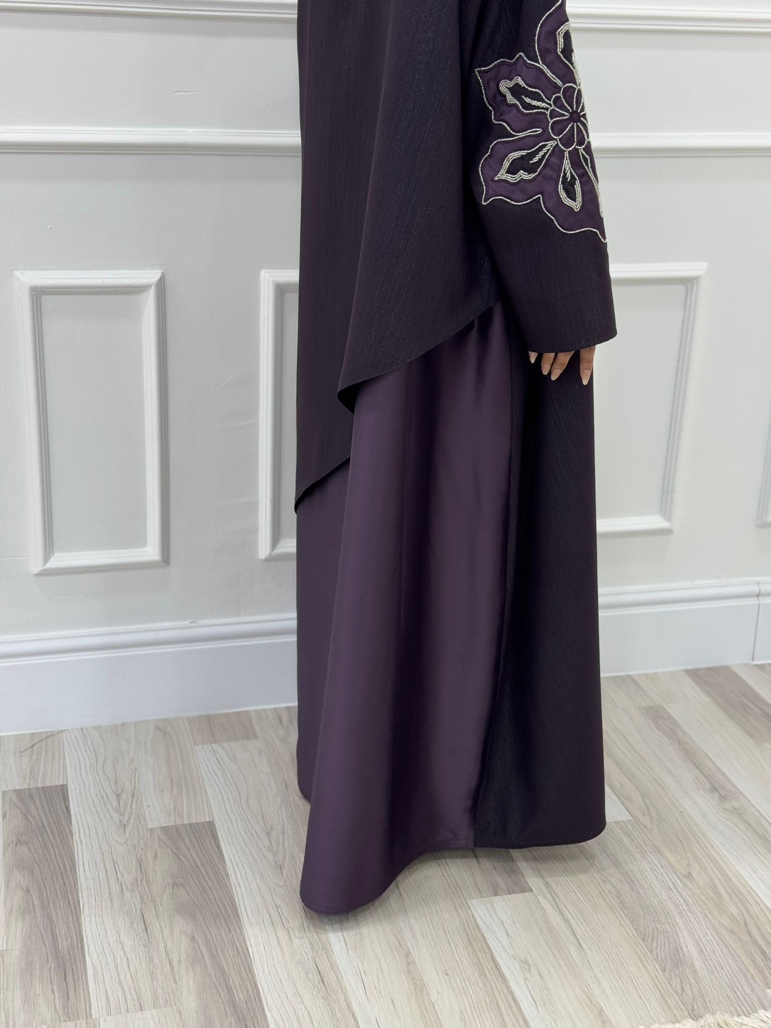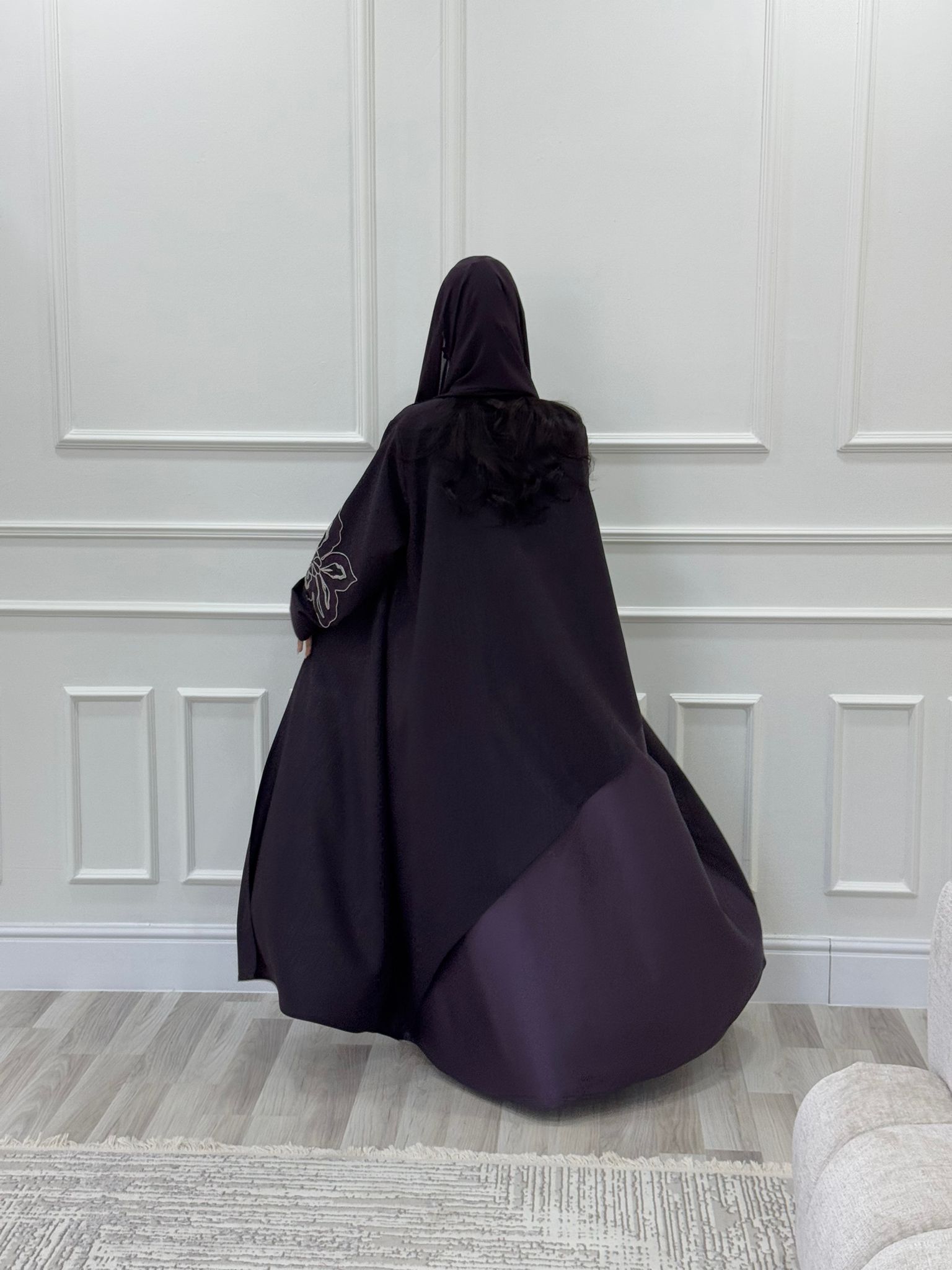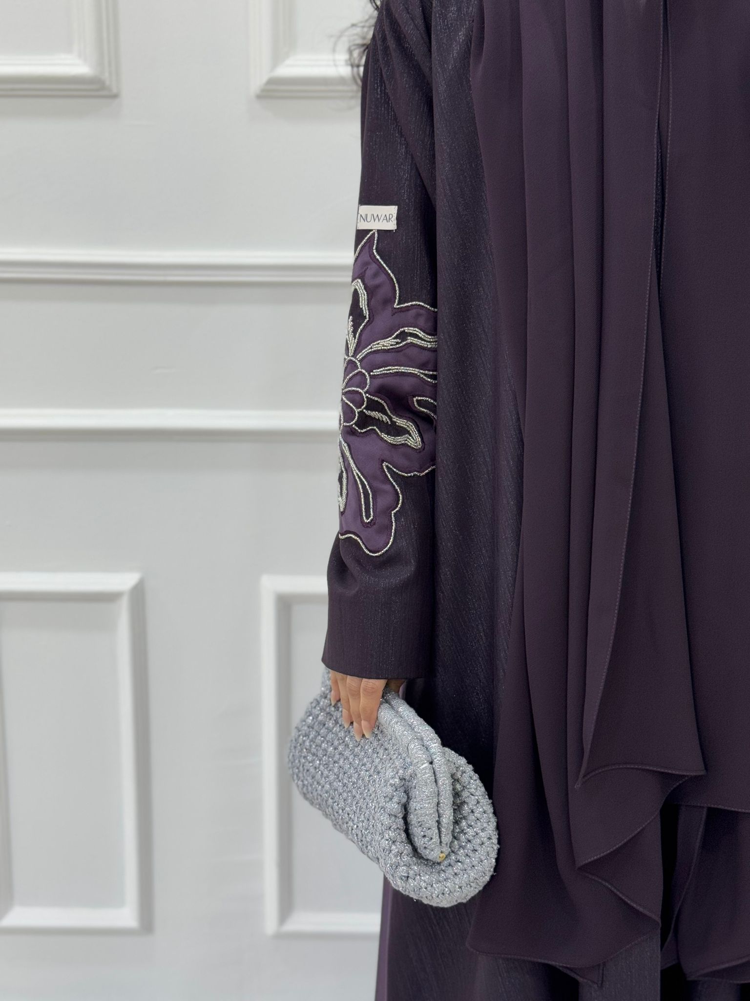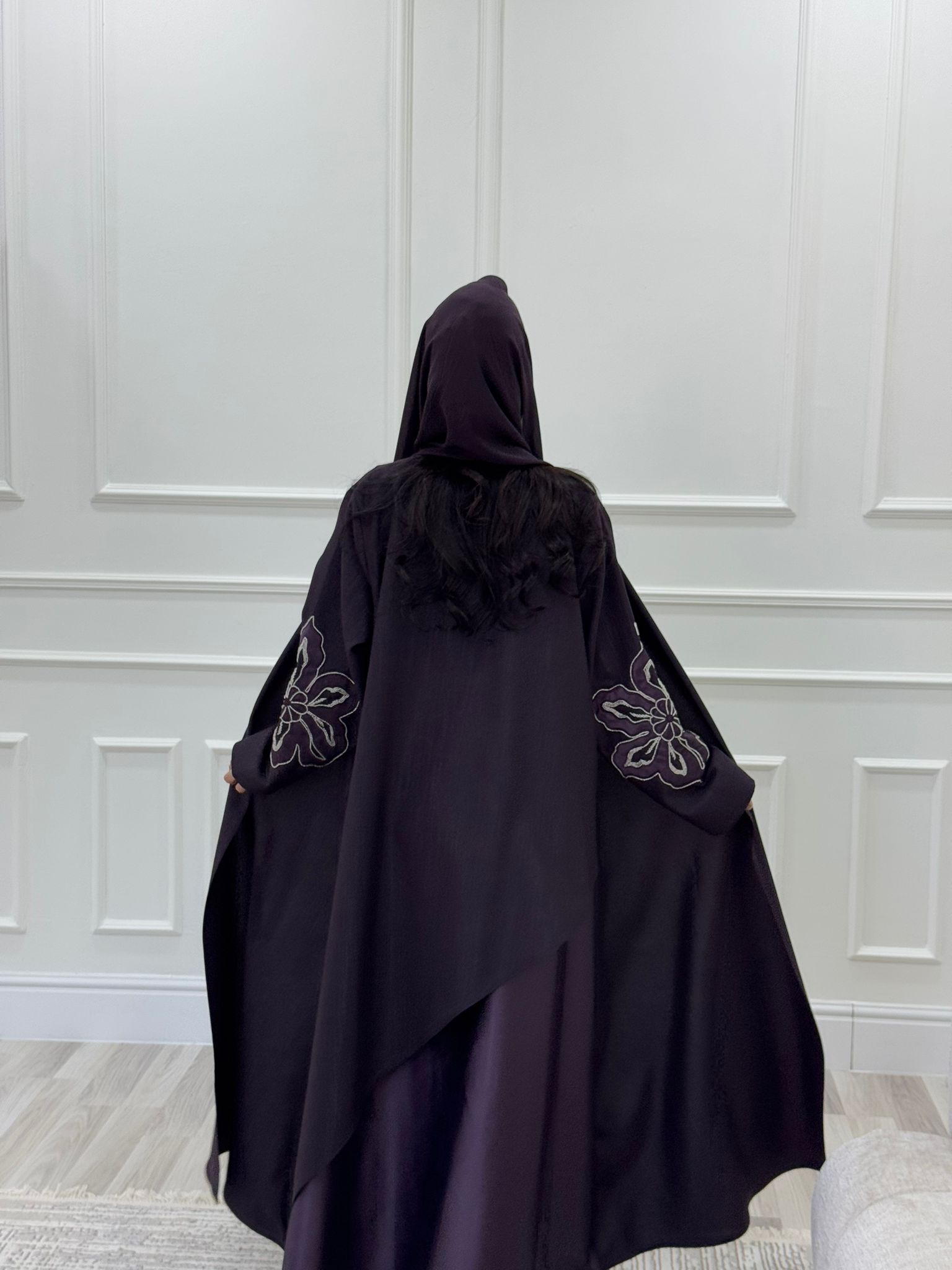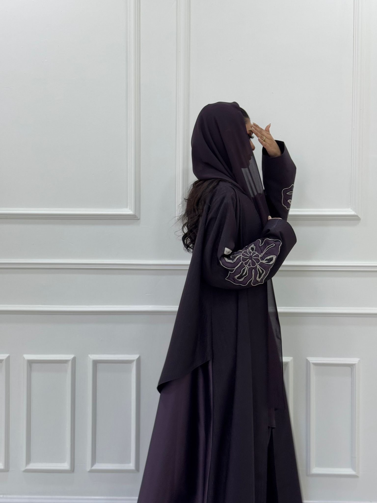 عباية صُممت بقماش الكريب البنفسجي اللامع و قماش التفته البنفسجي بقصة مميزه من الخلف مع ورده مطرزه بالخيوط و الشك الفضي اللامع فالاكمام.