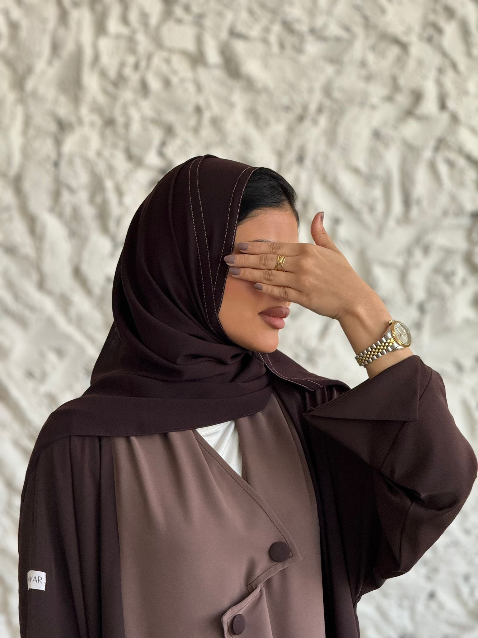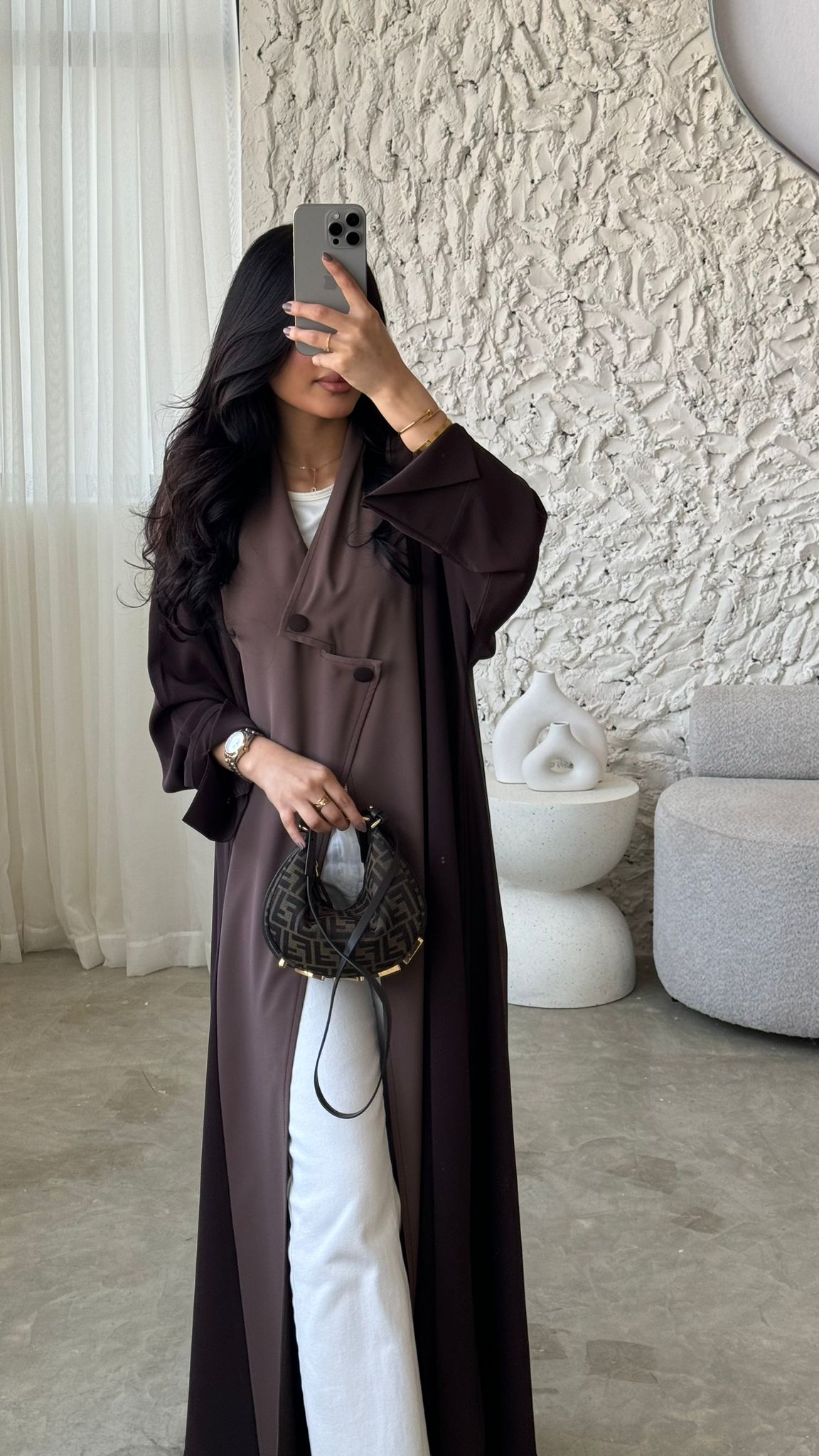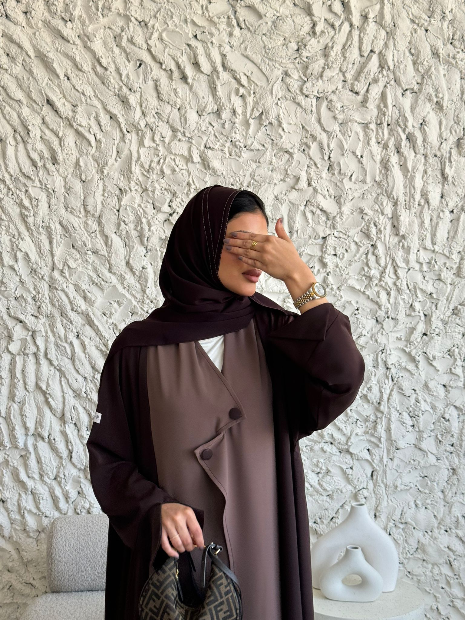 عباية قماشها الماس خفيف و عملي جدا باللون البني الغامق و البني الفاتح يتم اغلاقها بزرارين.