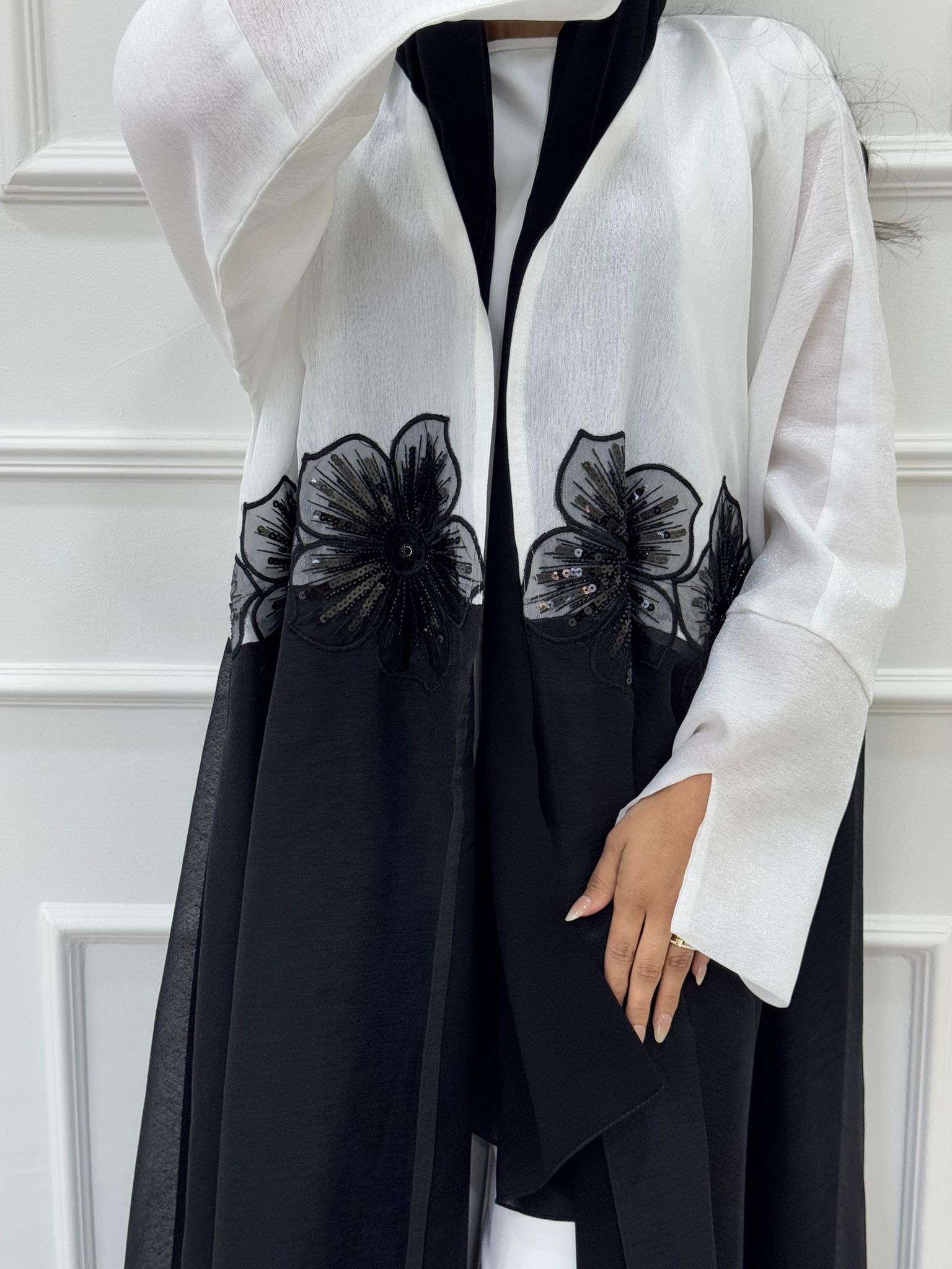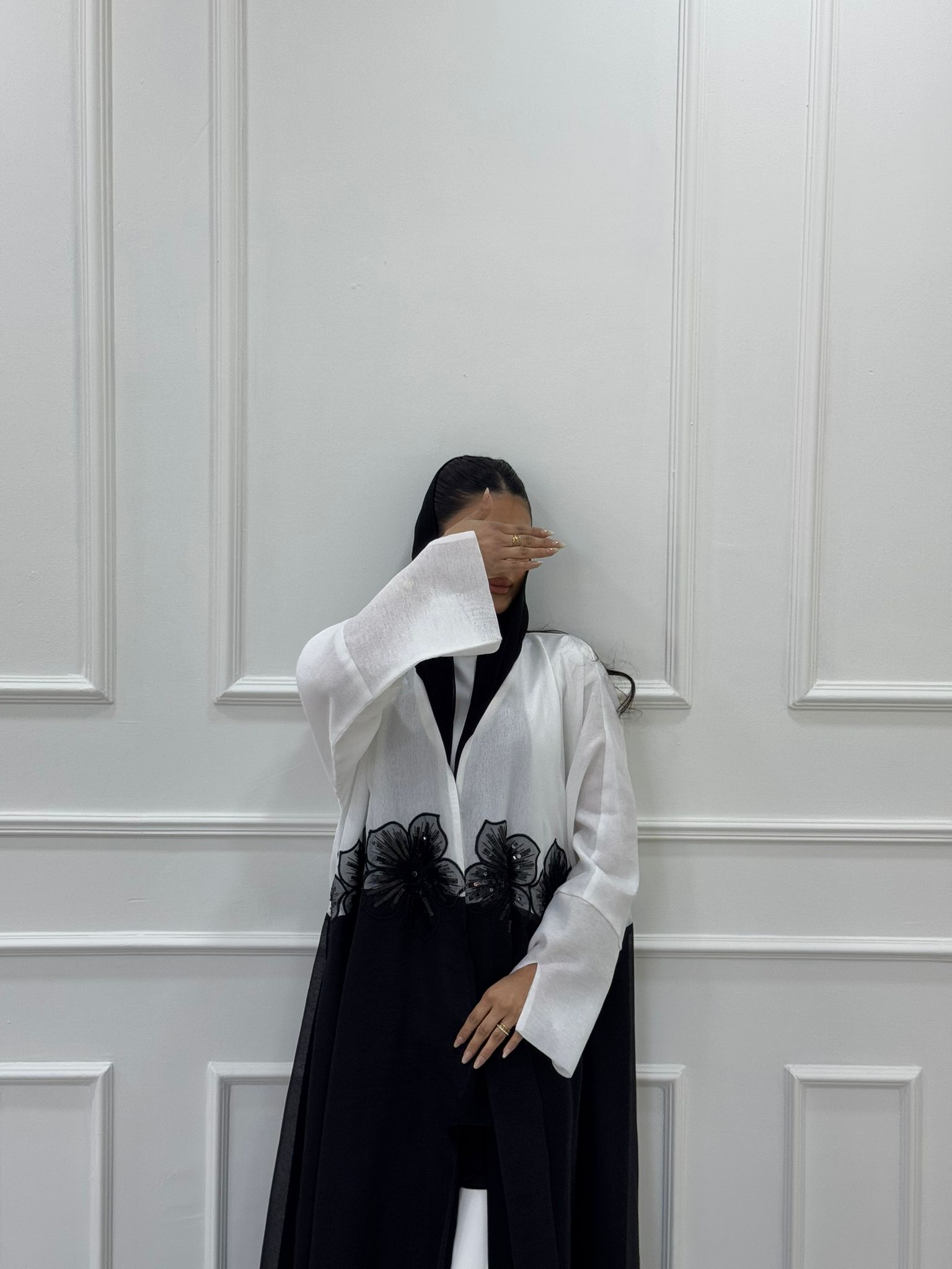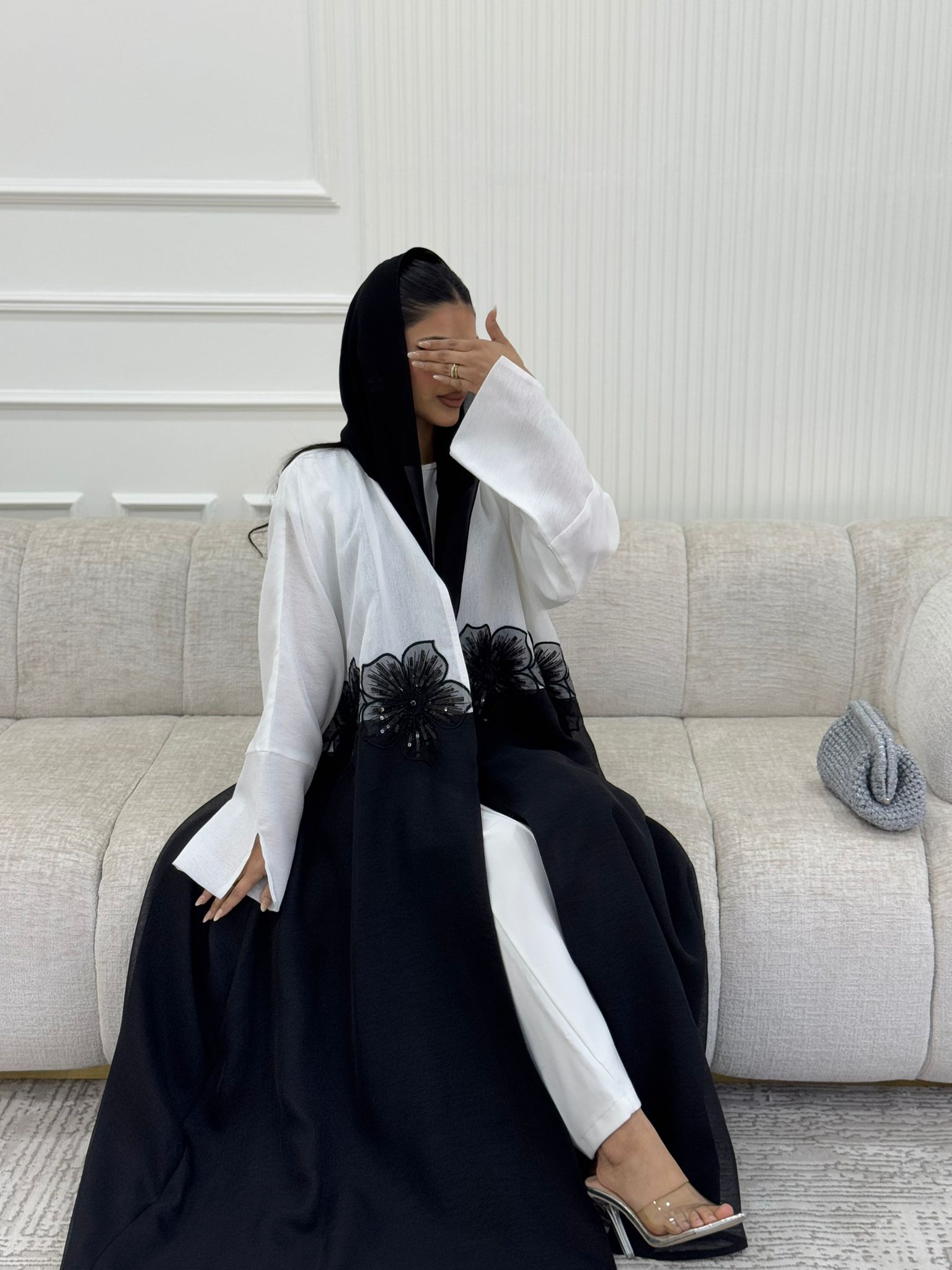 قماش العبايه: اورقنزا اسود و ابيض مبطن مع زيج ورد مشكوك بالفولك الاسود الامع في النصف.