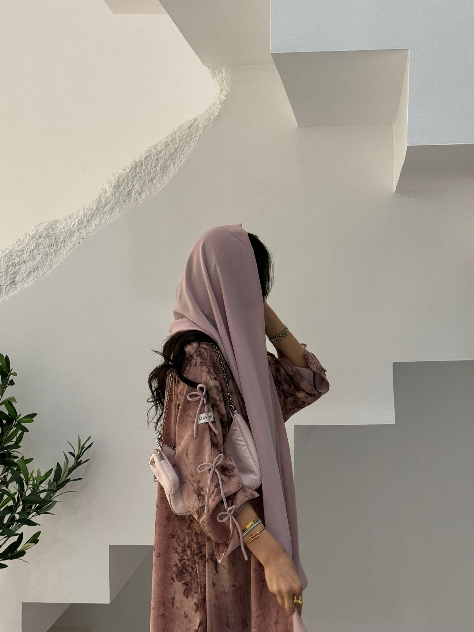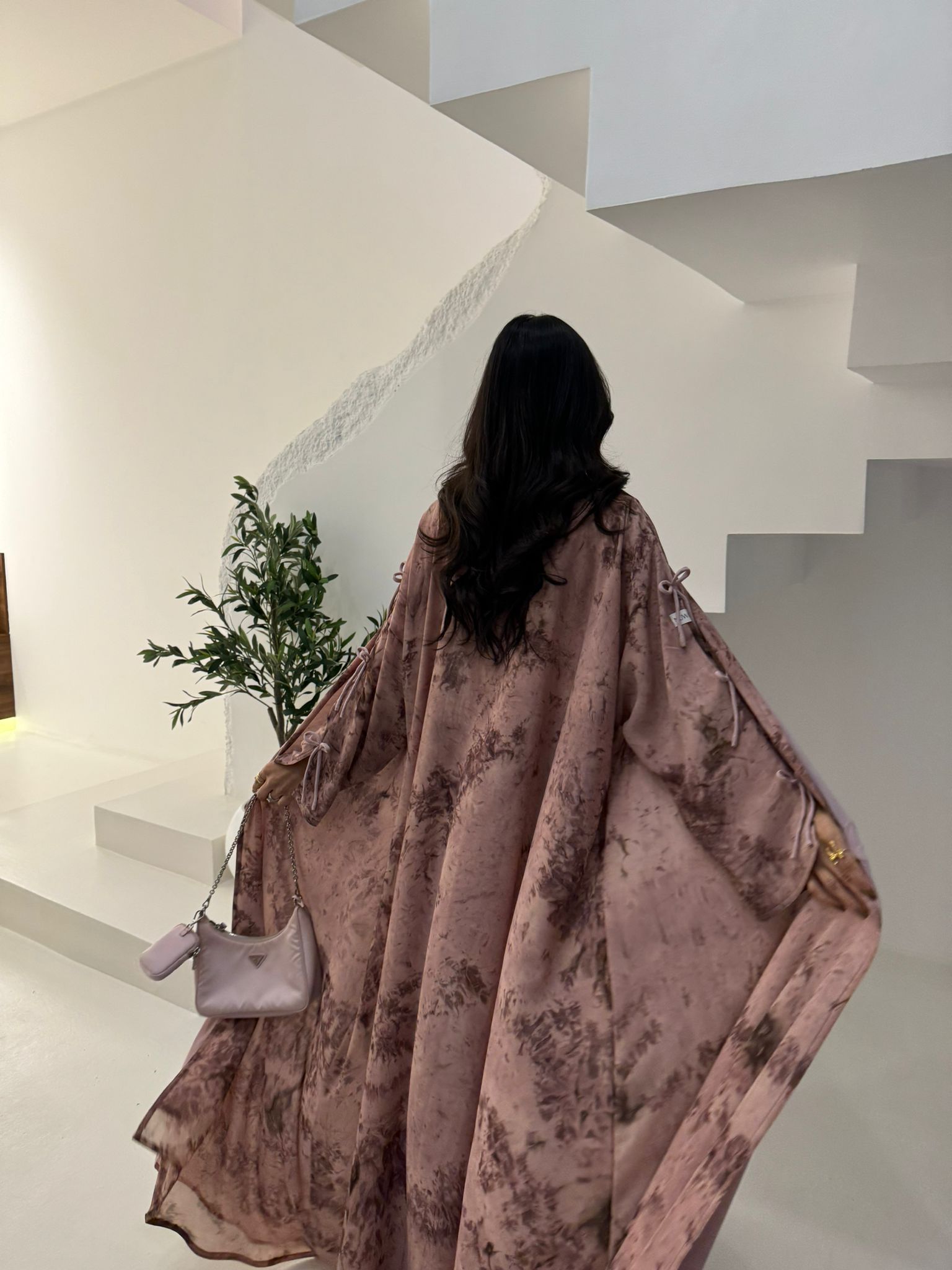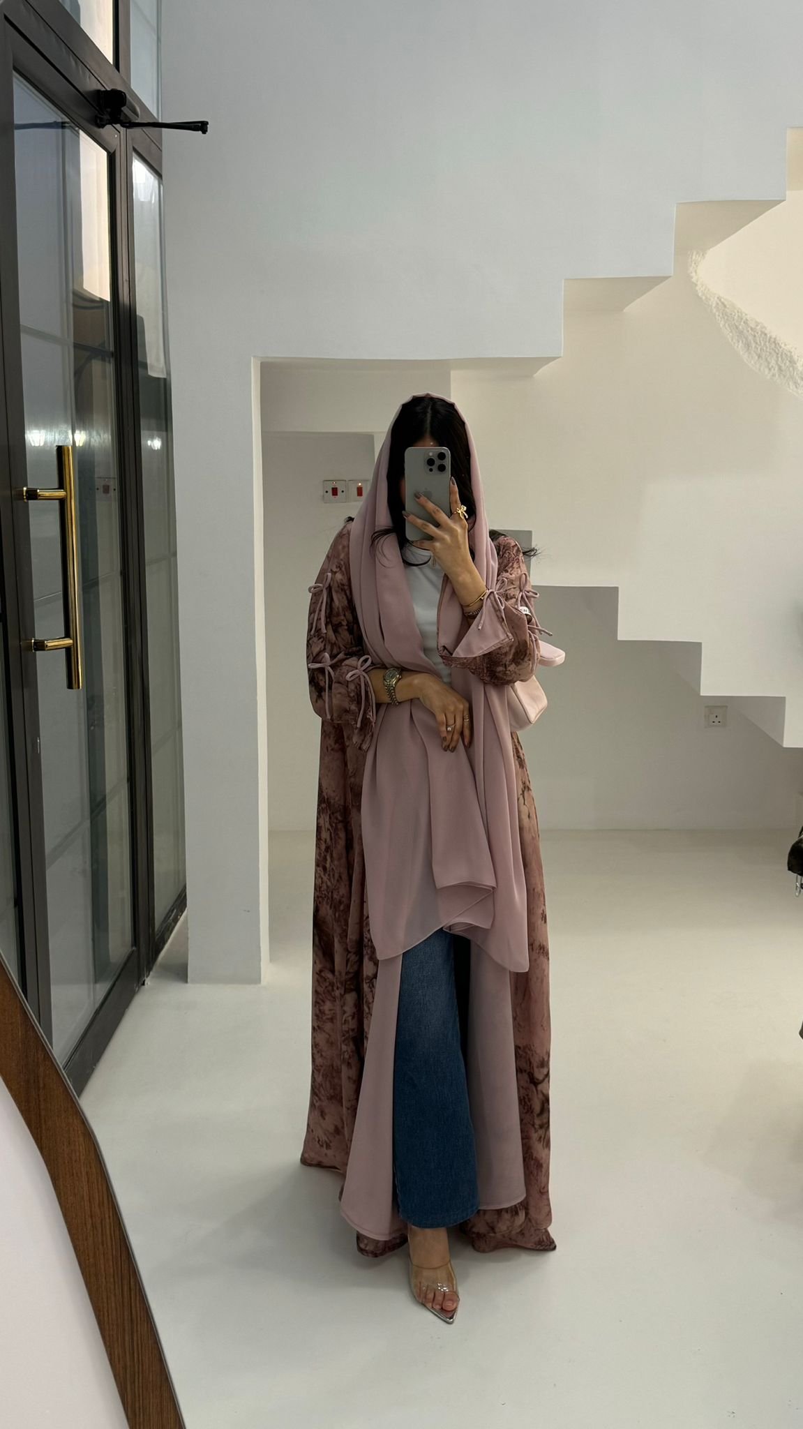 عباية بدرجات الوردي الفاتح مع فيونكات فالاكمام.