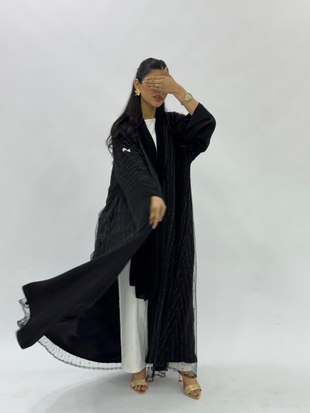 عباية شتويّة باللون الاسود بنقشات مخمليه ورديه