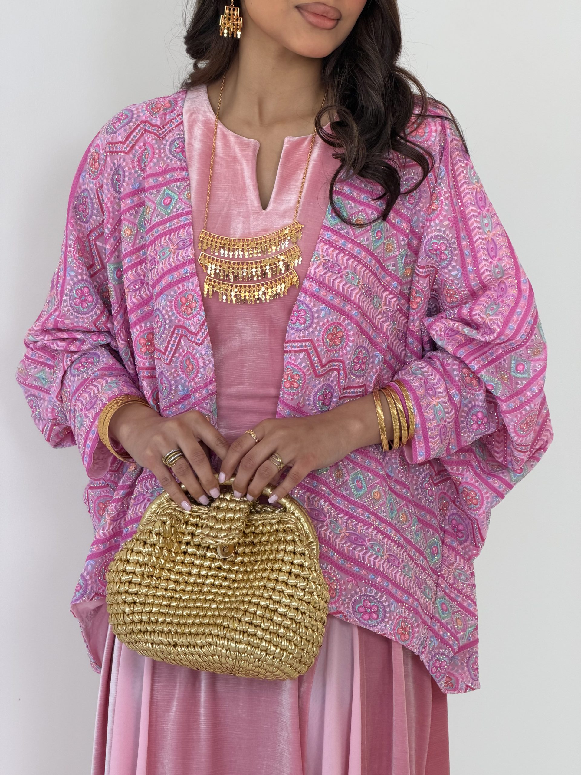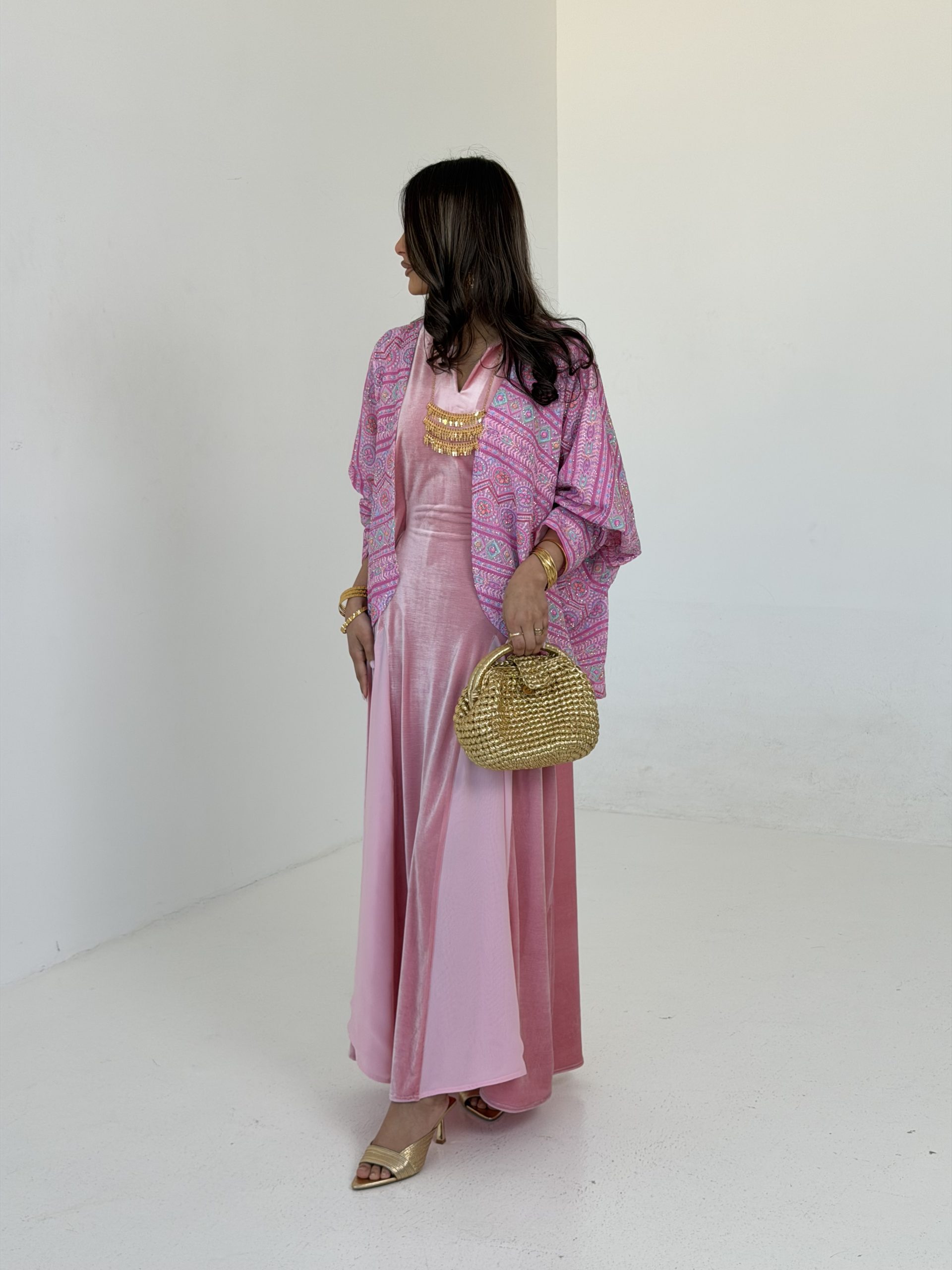 فستان مخمل وردي مع حزام داخلي للتضييق حسب الرغبة + قميص بقماش الشيفون المبطن اللامع