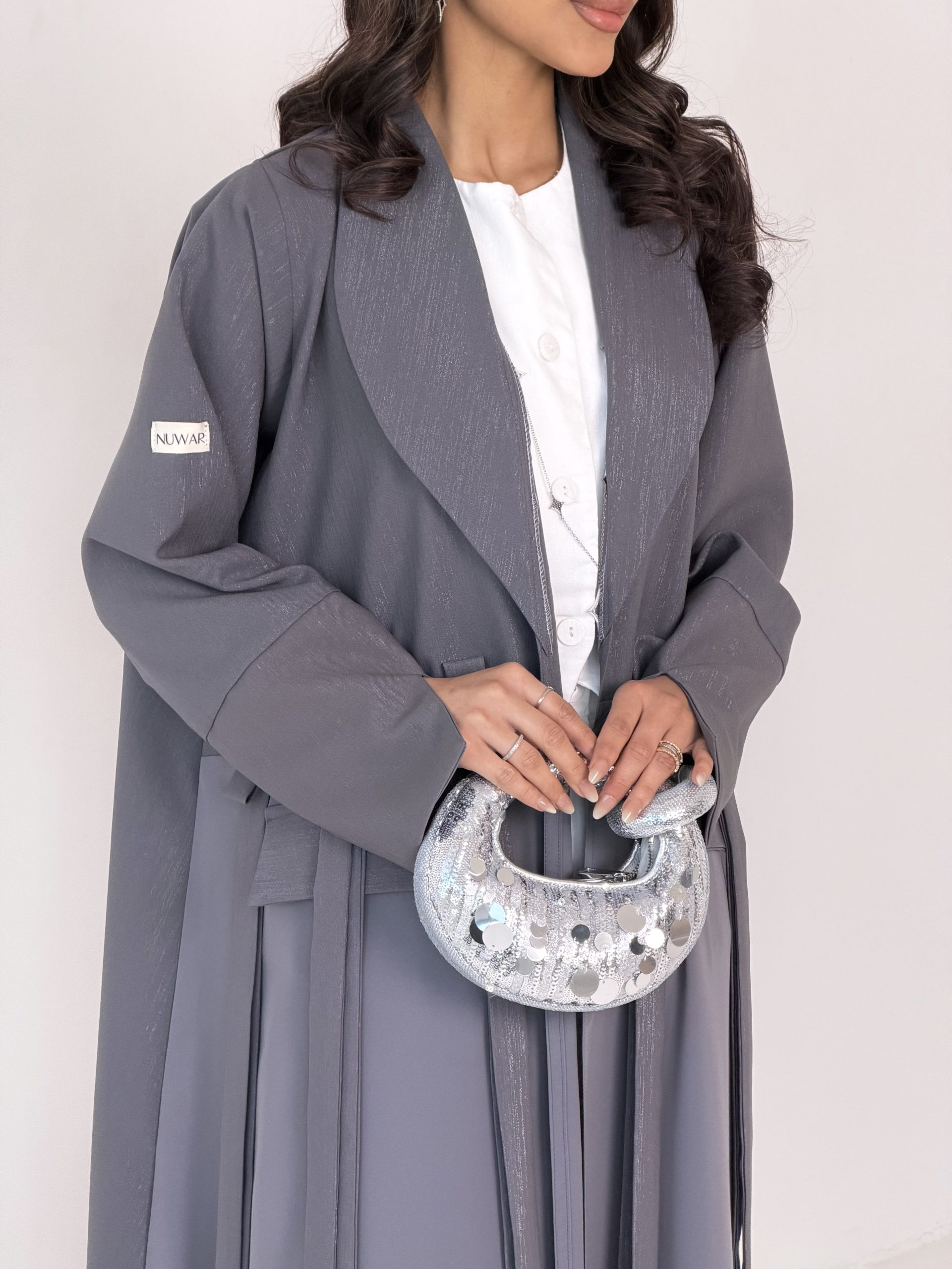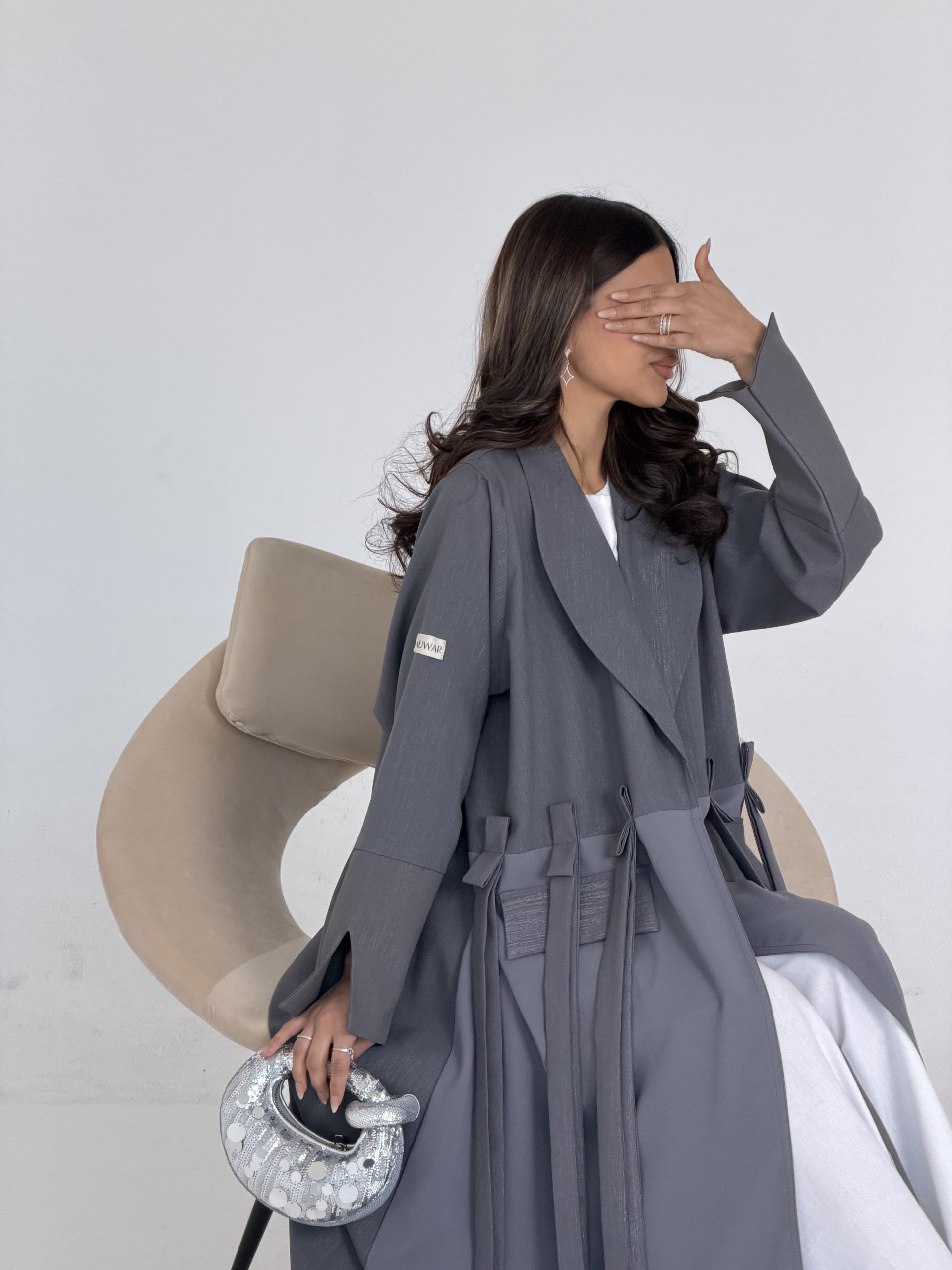 قماش العباية: كريب رمادي لامع + قماش الماس رمادي