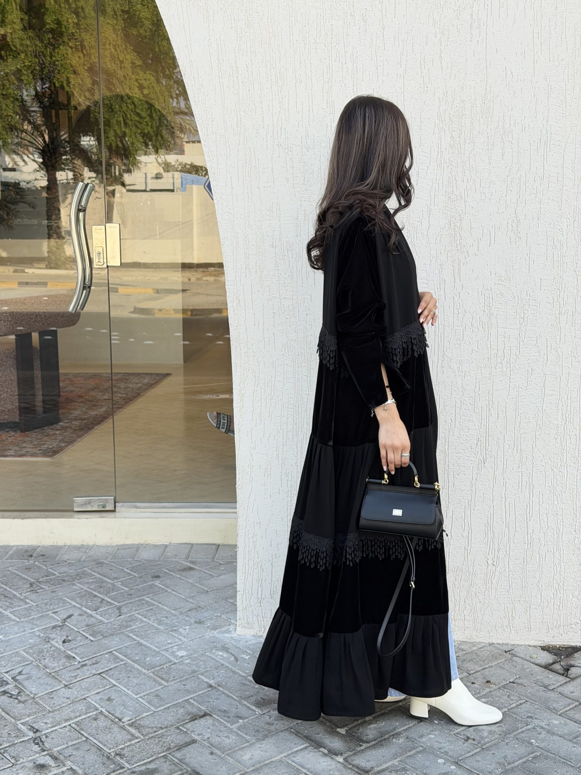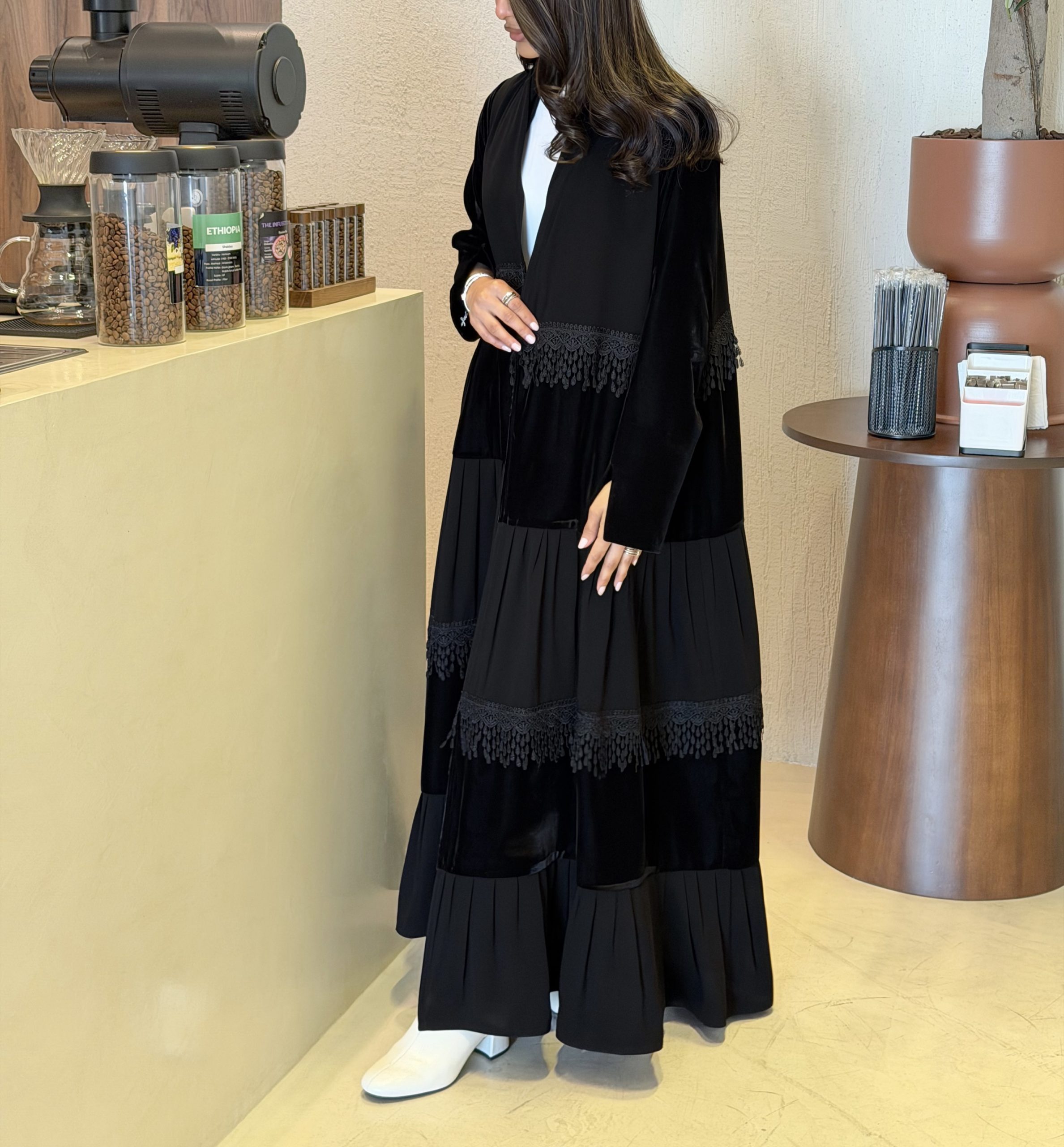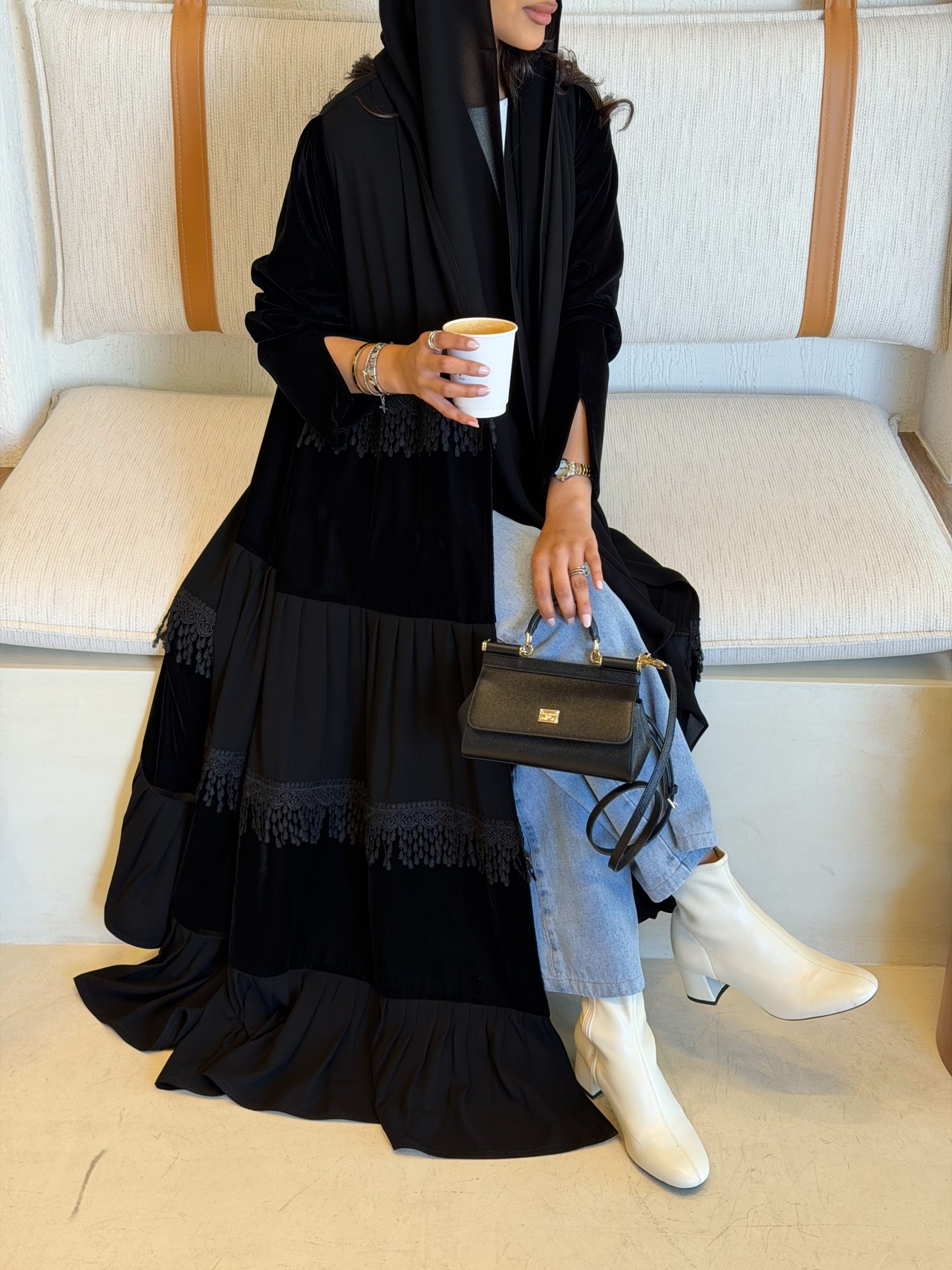 قماش العبايه: مستقبل كوري و مخمل اسود مع تدخيلة هدب دانتيل.