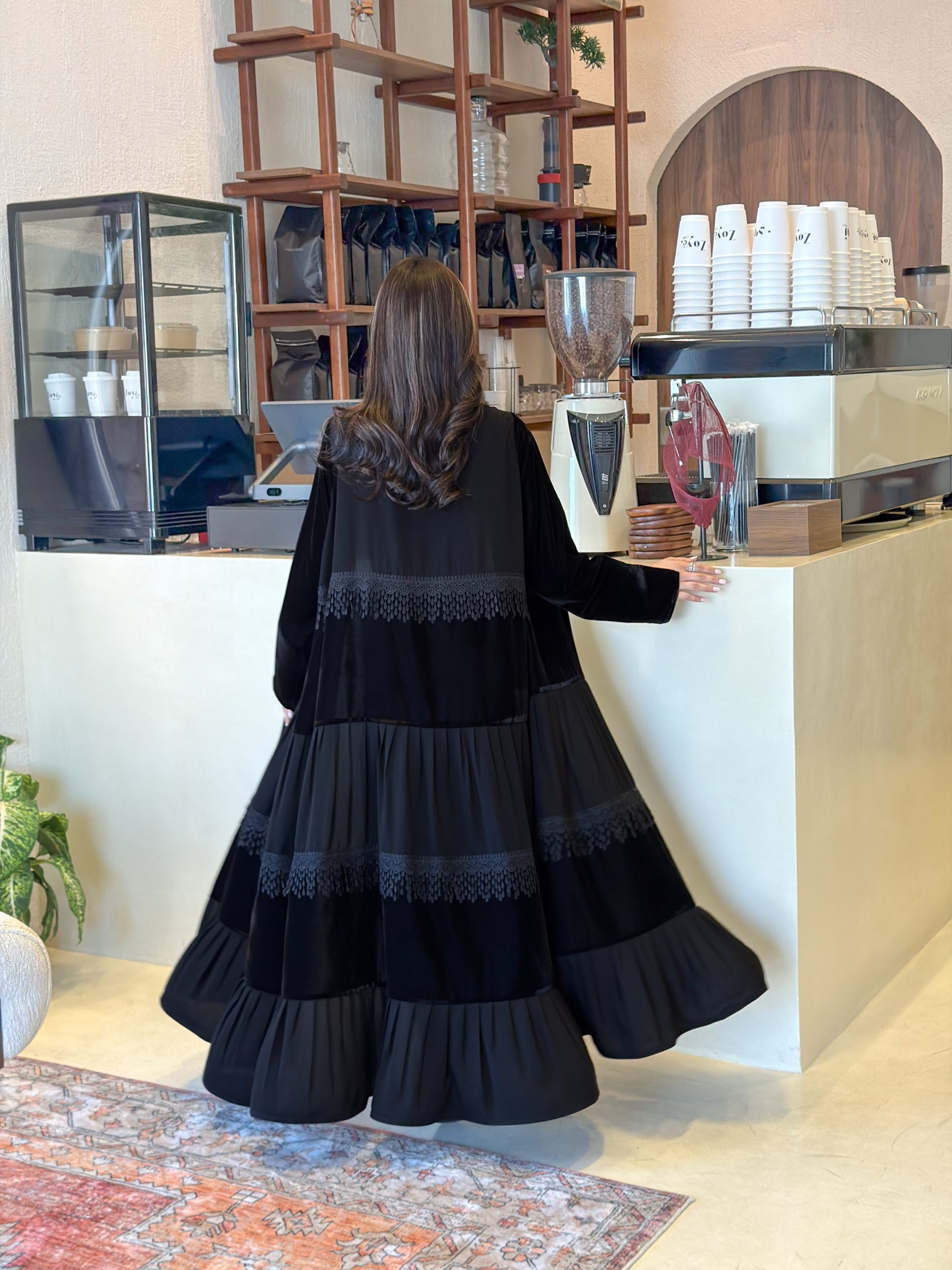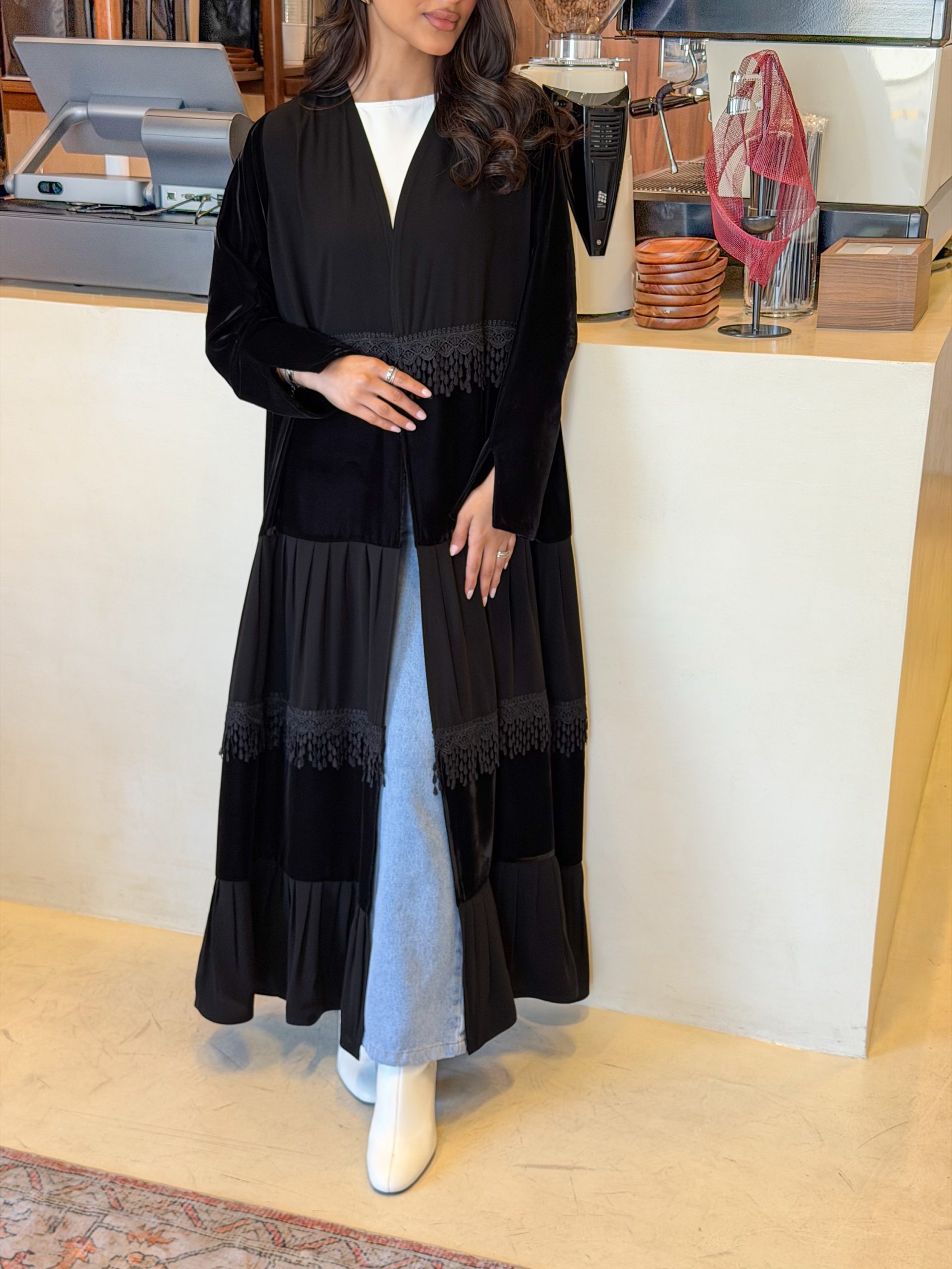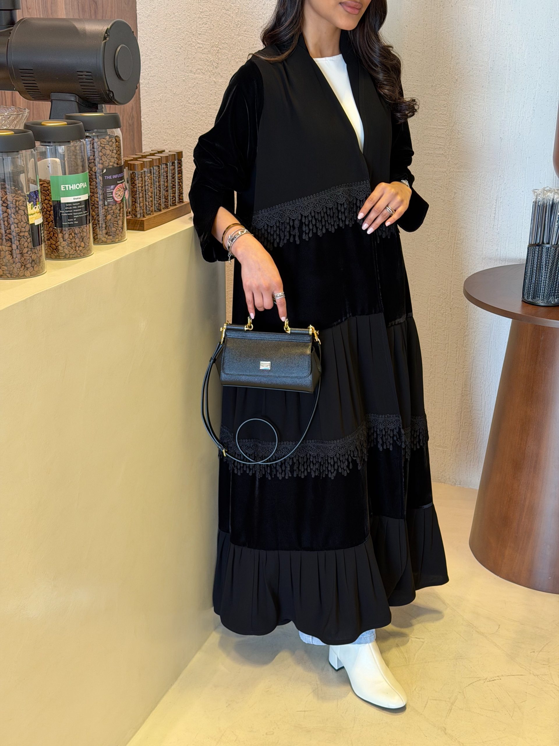 قماش العبايه: مستقبل كوري و مخمل اسود مع تدخيلة هدب دانتيل.