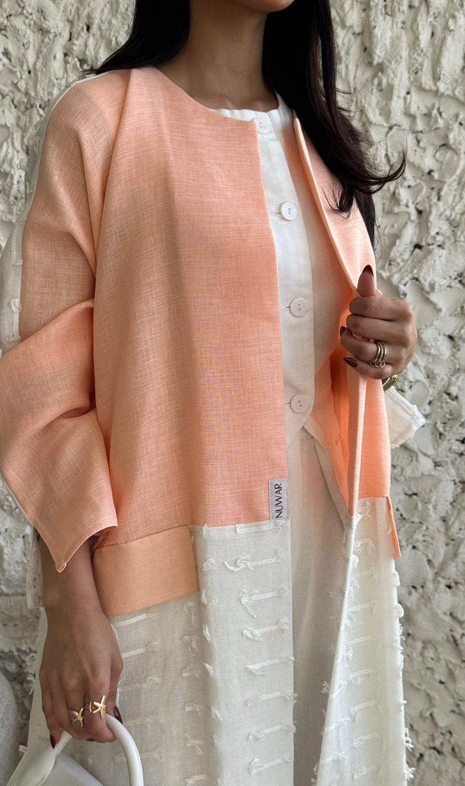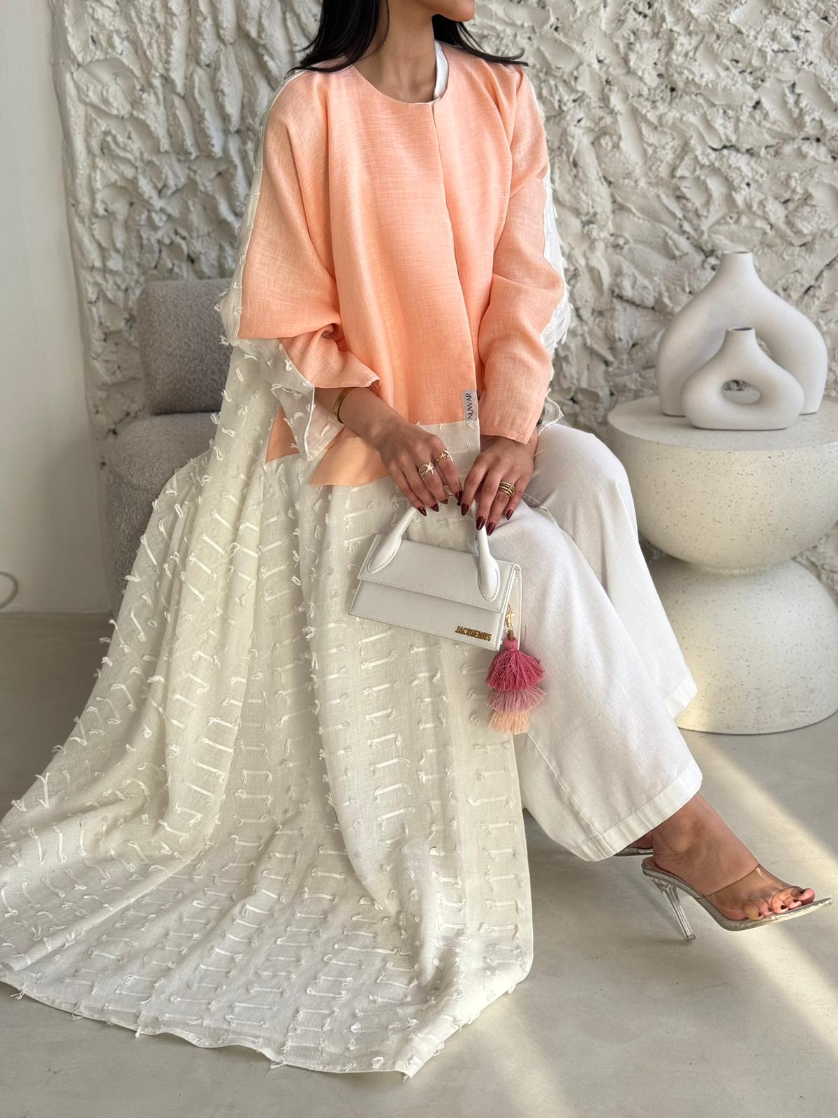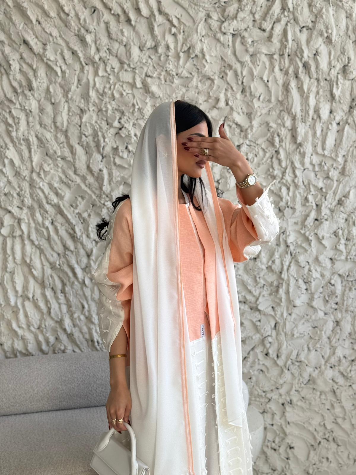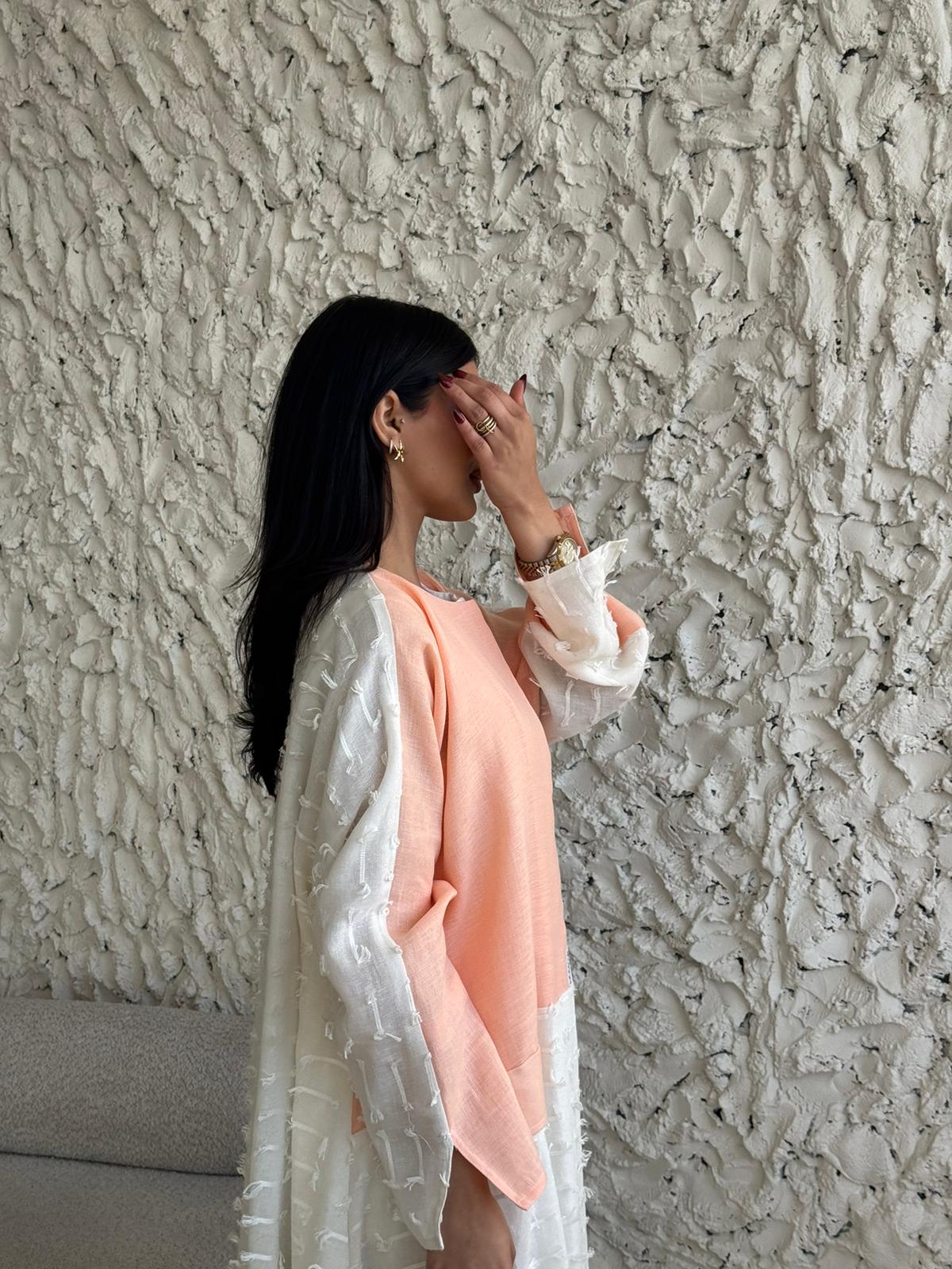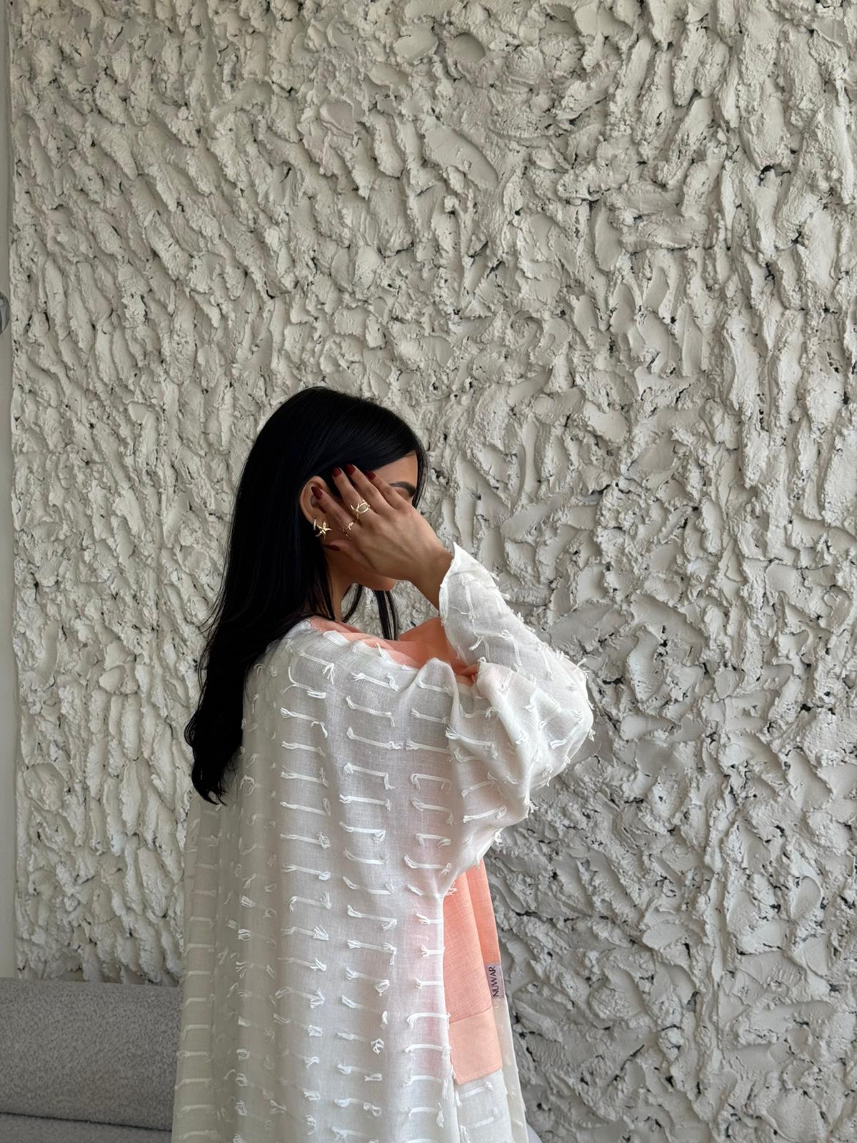 قماش العباية: لنن ابيض مبطن مع لنن بطيخي