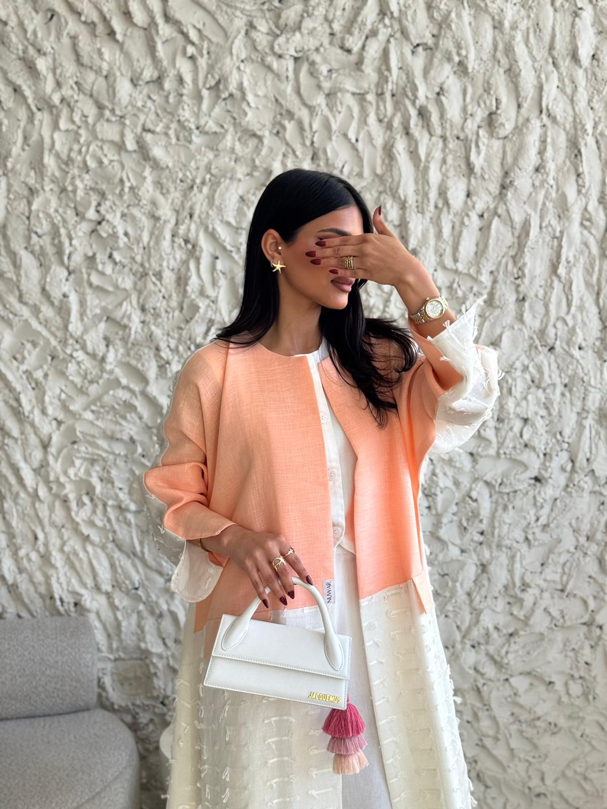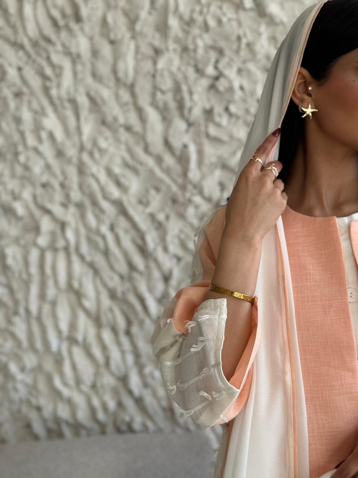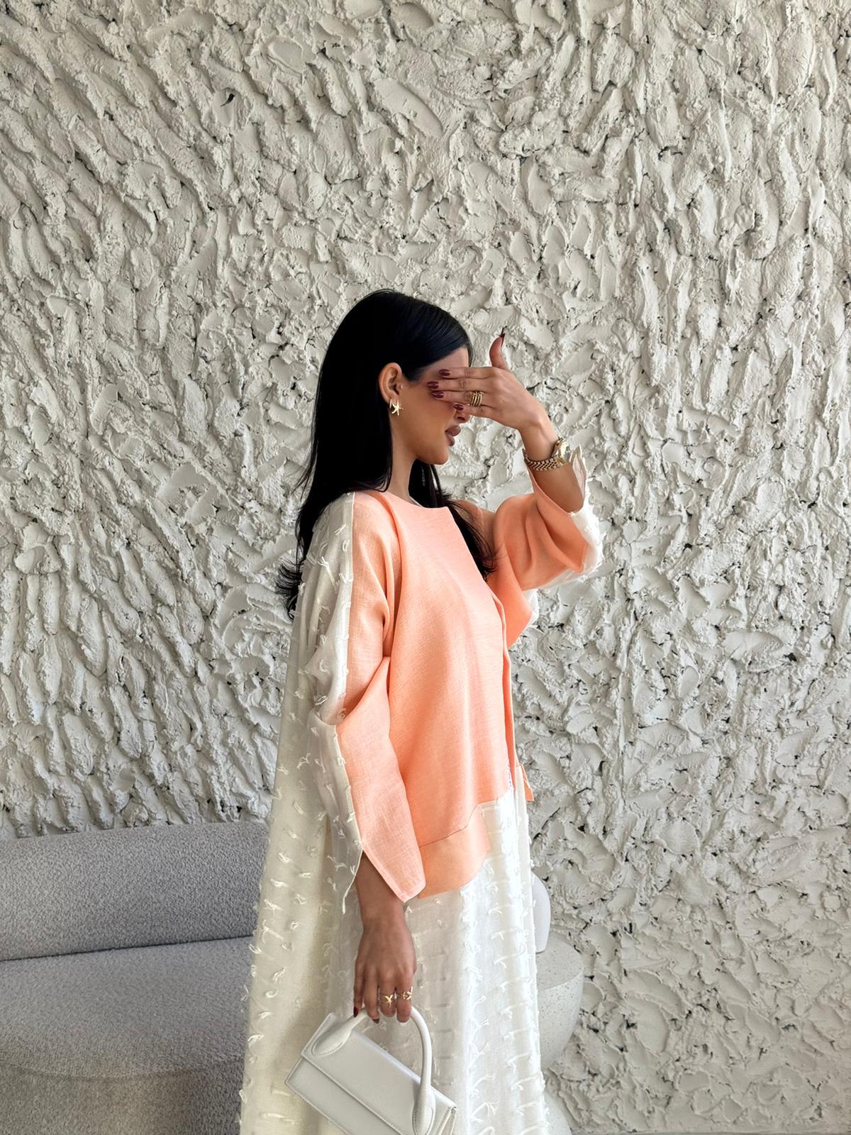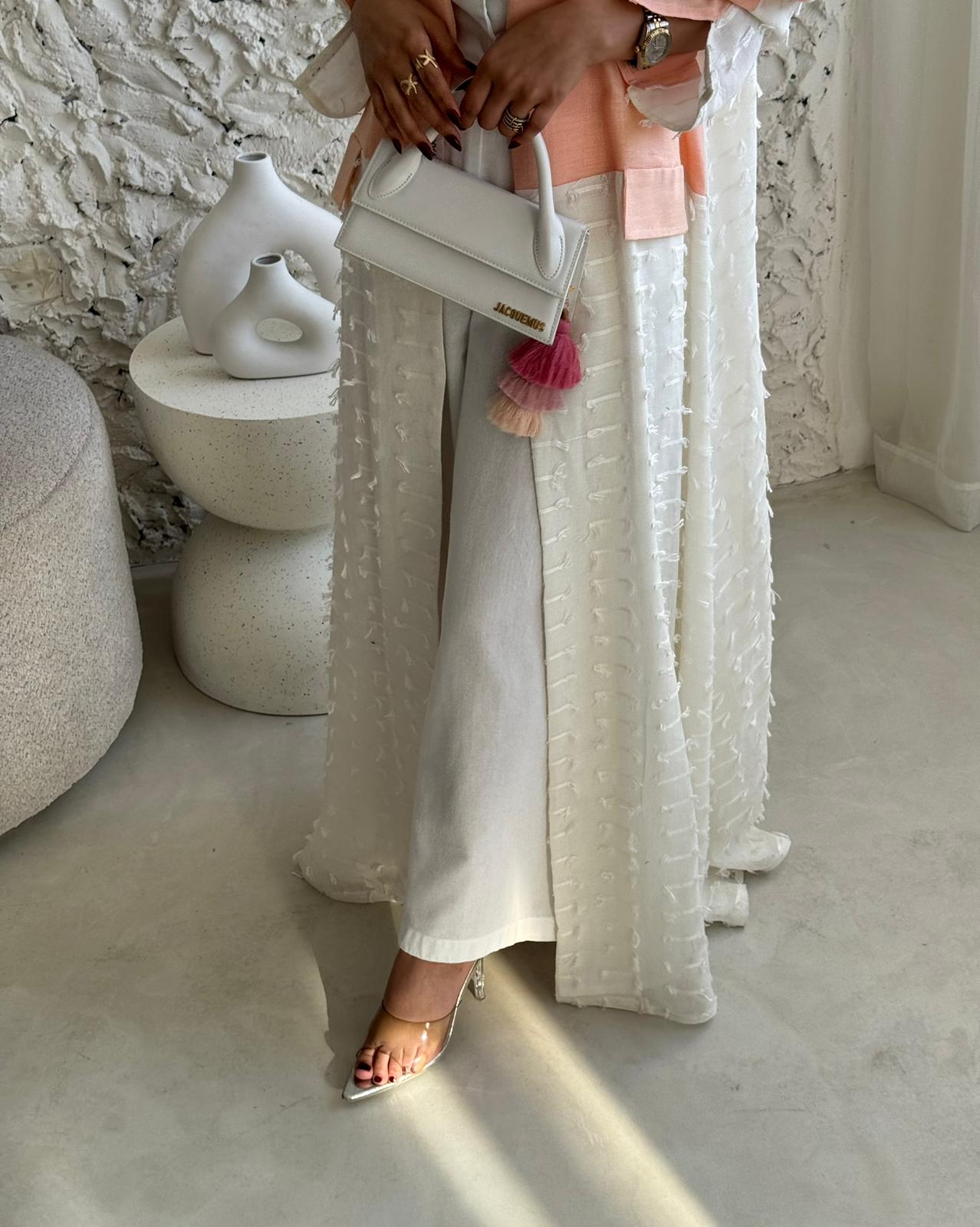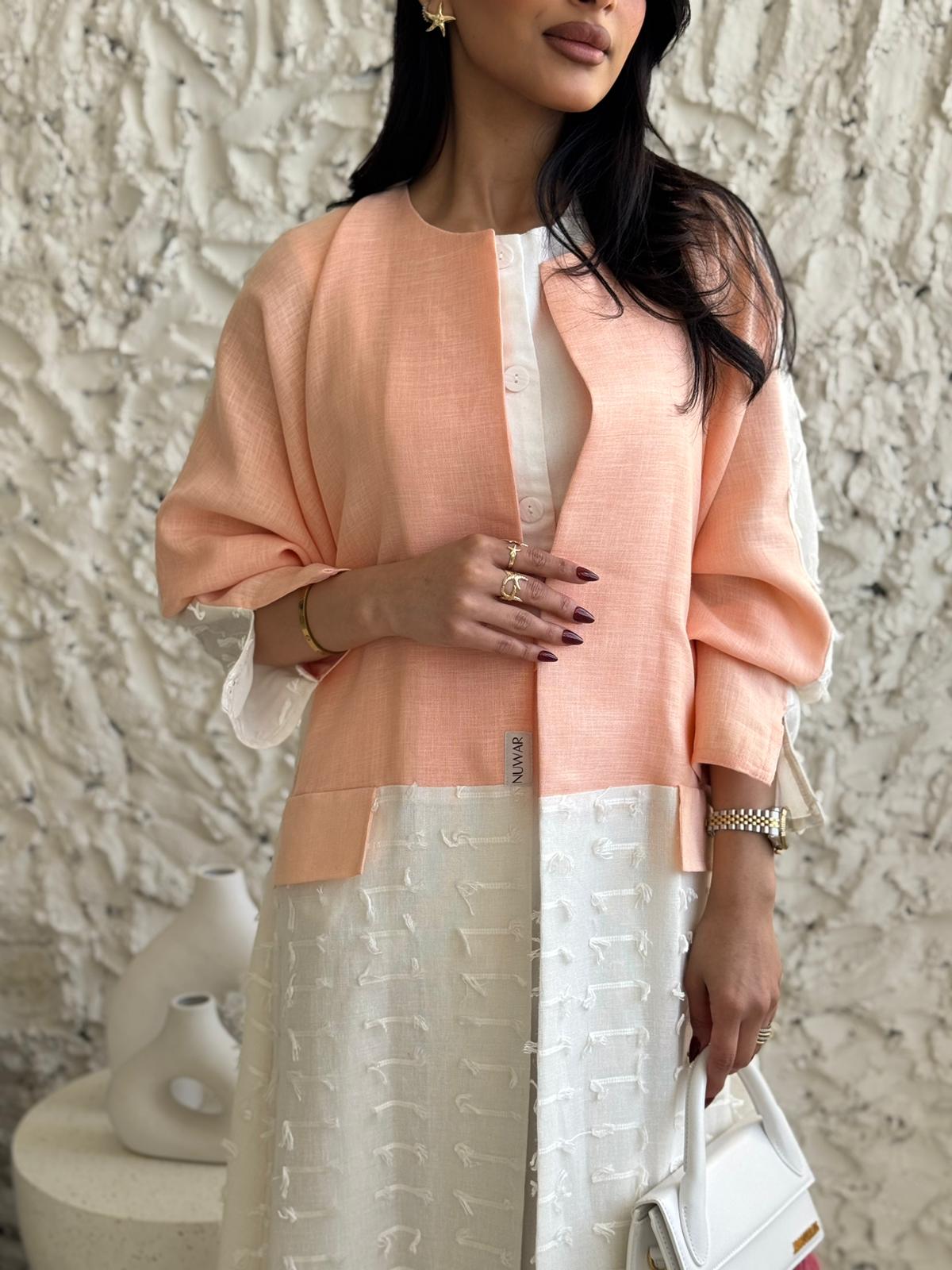 قماش العباية: لنن ابيض مبطن مع لنن بطيخي