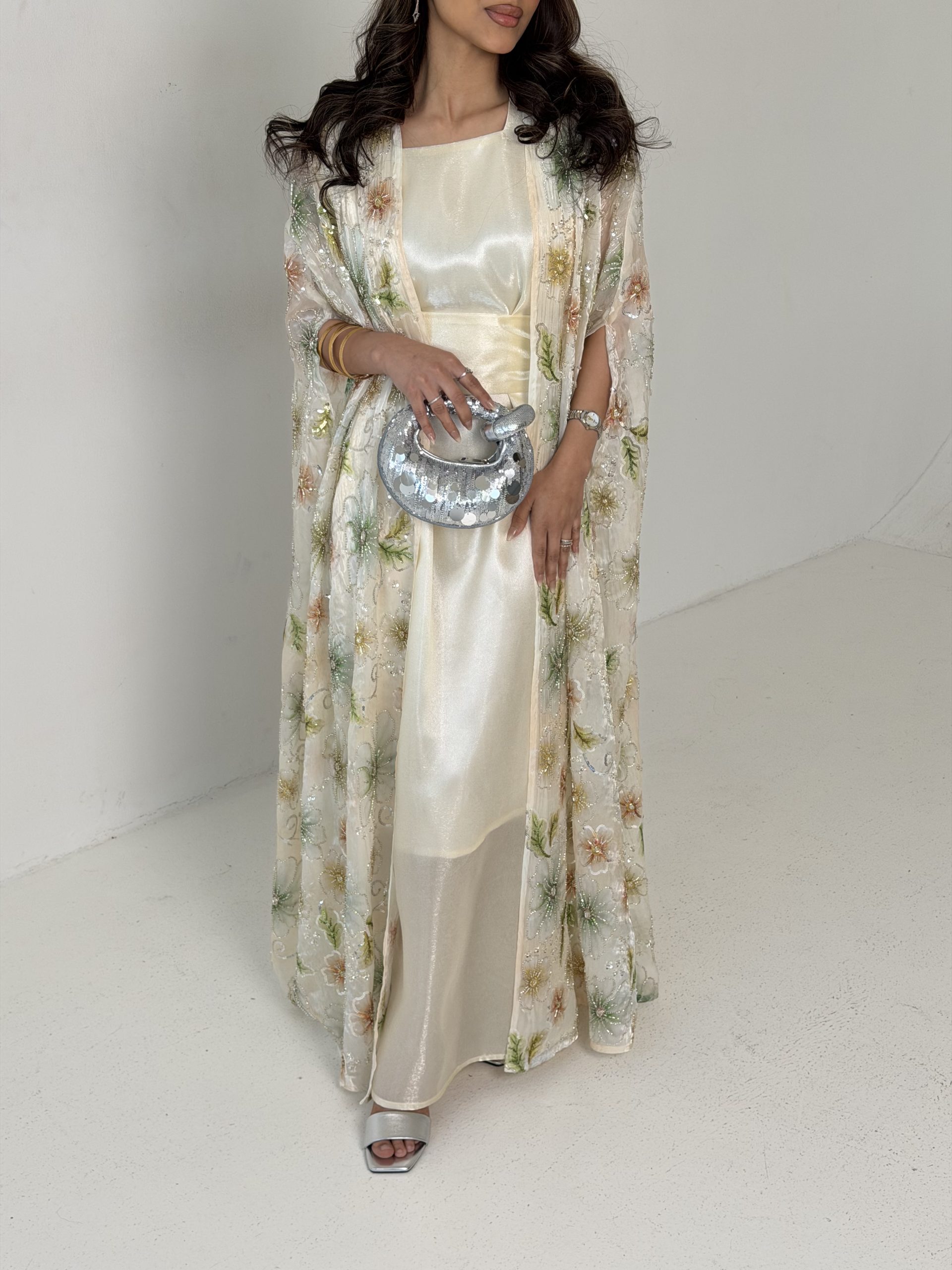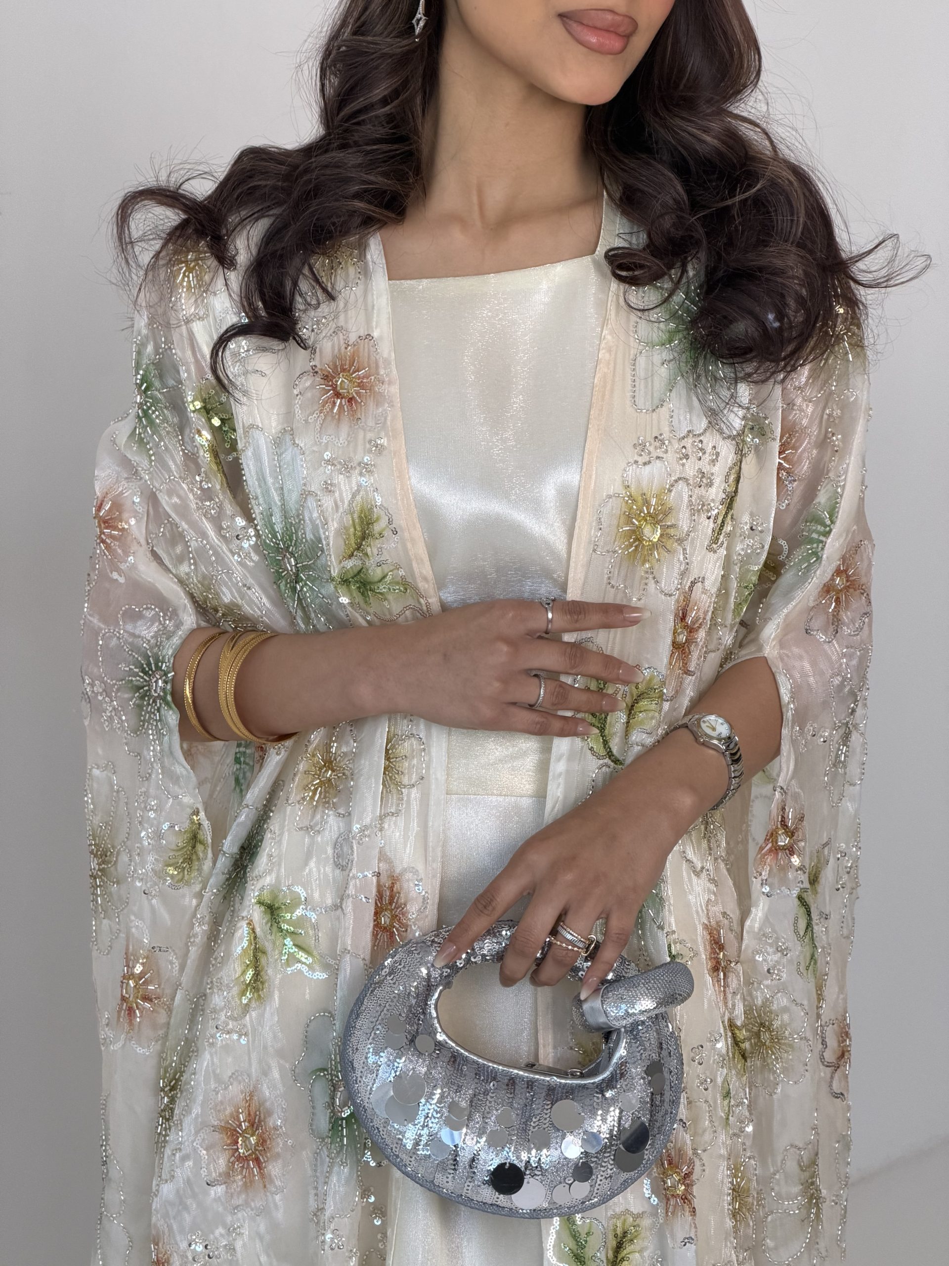 فستان اورقنزا اوف وايت مبطن + بشت اورقنزا غير مبطن مطرز بالشك كامل + حزام