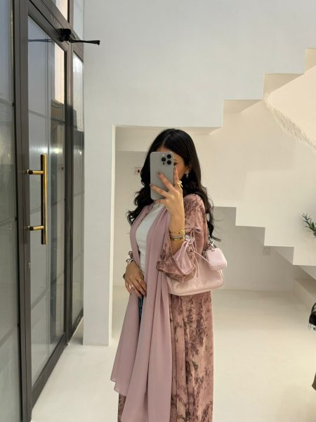قماش العباية: مخمل شيفون اسود بنقشات ورود مخمل وردية مع مخمل مكسر وردي فالاكمام.