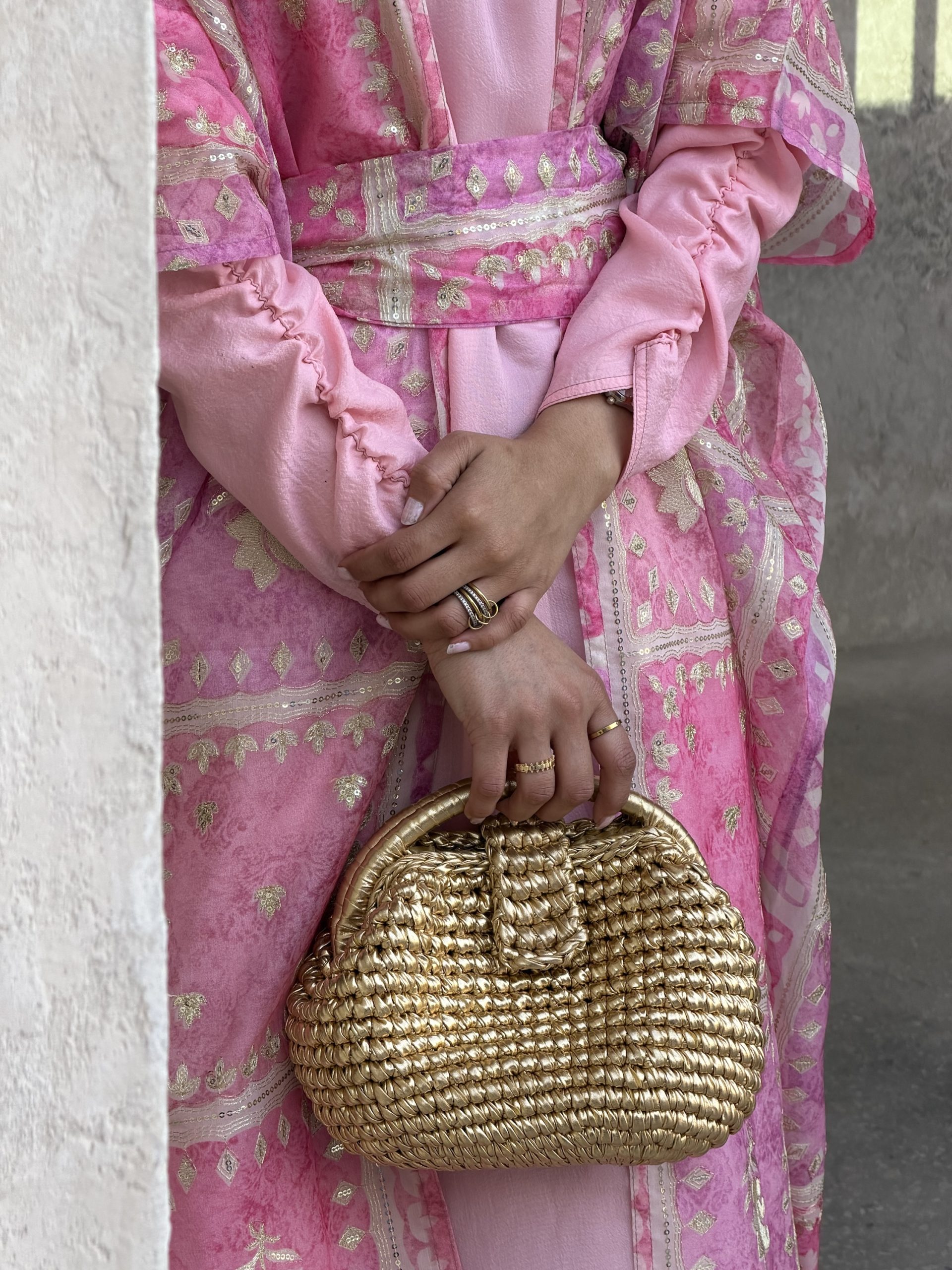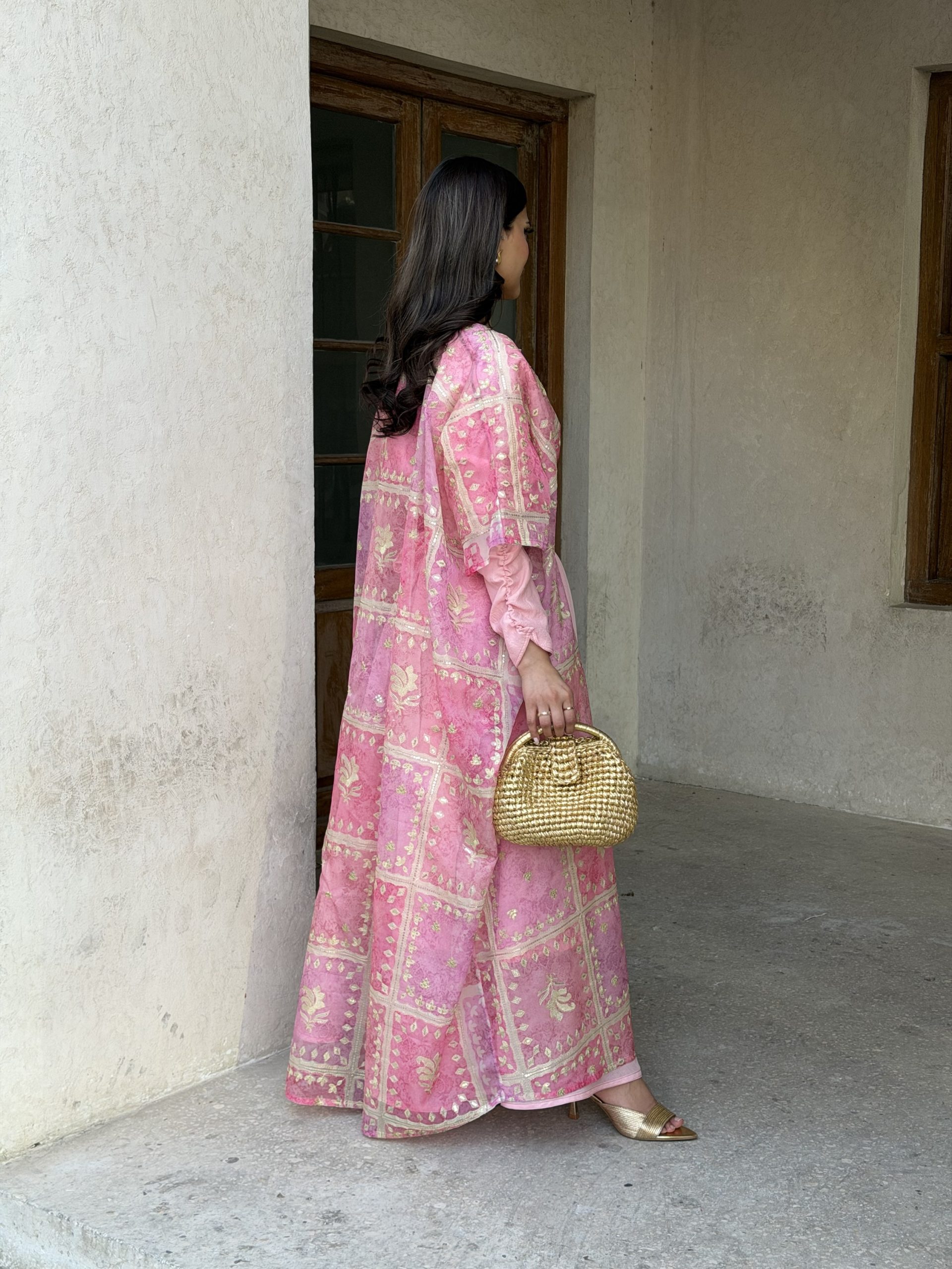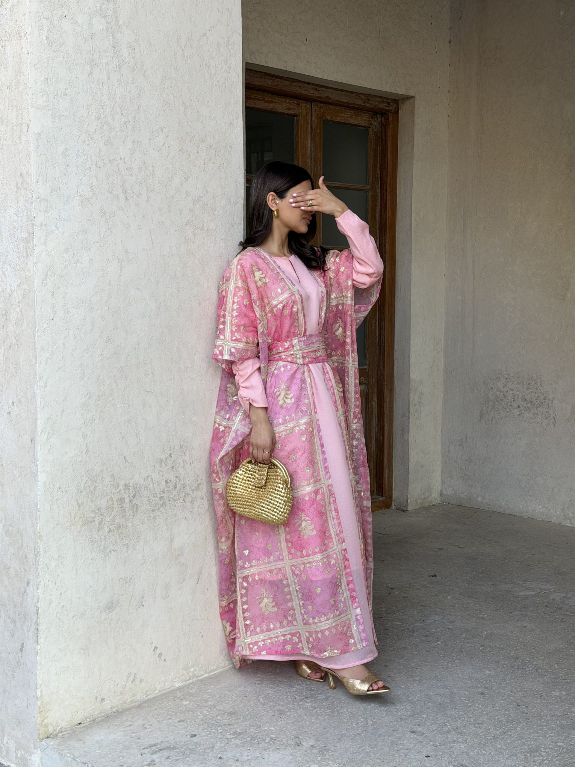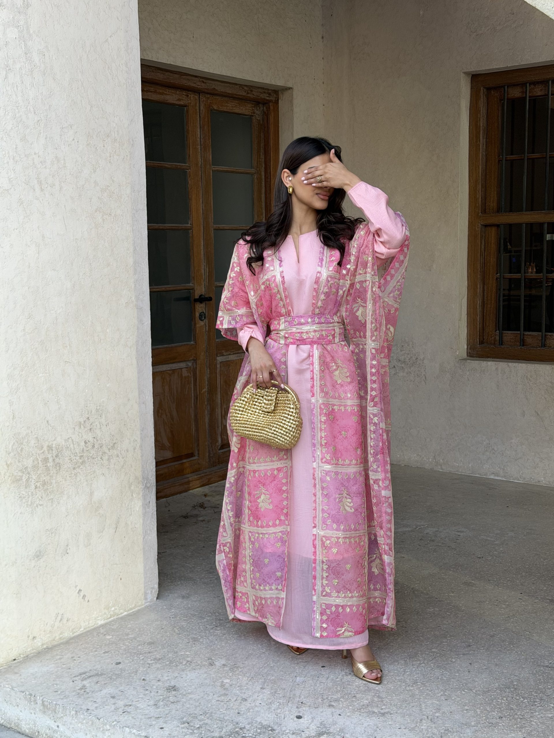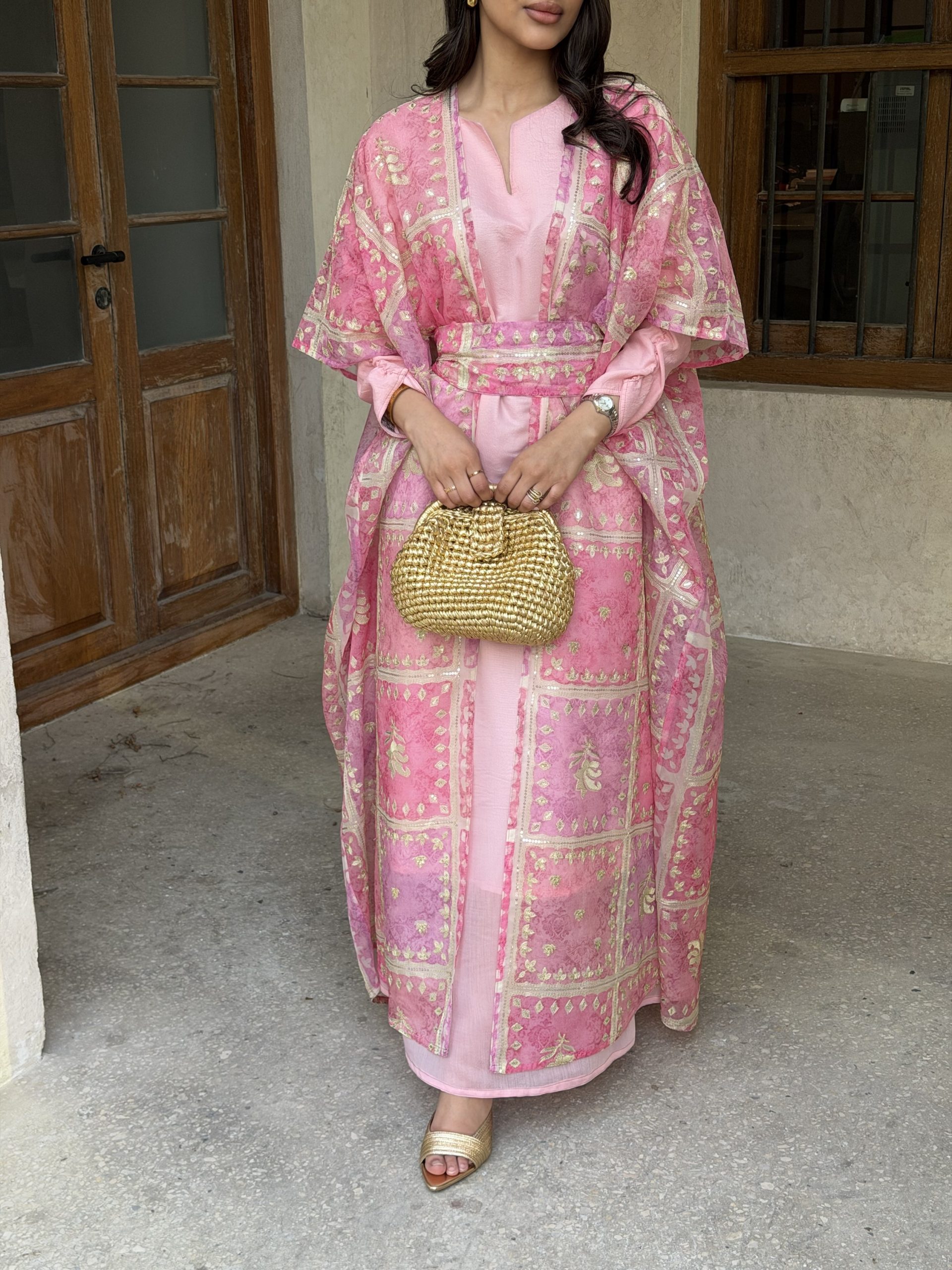 جلابية فخمة و زاهية بمزيج من درجات اللون الوردي مكونة من ٣ قطع (فستان اورقنزا مزموم الاكمام + بشت اورقنزا مطرز + حزام)